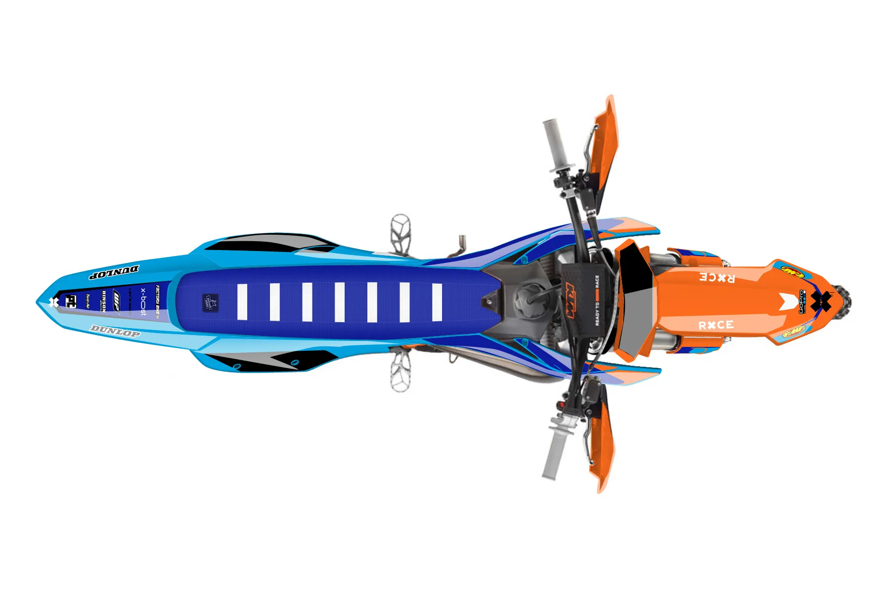 «Signature» — готовый комплект графики серии Flow для KTM Offroad Graphic Kit KTM XC 300 2023. В комплекте: графика на бак и боковые облицовки, крылья (переднее и заднее), передний щиток, номерные таблички, защита вилки. Материал: ПВХ-винил 80 мкр с холодной ламинацией 300 мкр, общая толщина 380 мкр; покрытие глянцевое или матовое на выбор. Устойчив к UV-излучению, воде, бензину и мойке высокого давления. Клей акриловый на сольвентной основе — постоянный, для гибких пластиков. На простых поверхностях монтируется без нагрева; для сложных изгибов рекомендуем фен. Этот пресет можно заказать как есть или взять за основу в конструкторе: поменять цвета, добавить стартовый номер и свой бренд. Производство — 3–5 рабочих дней, доставка по России СДЭКом или Почтой, по СНГ — курьерскими службами.