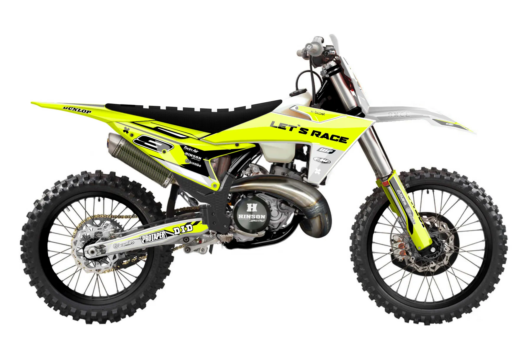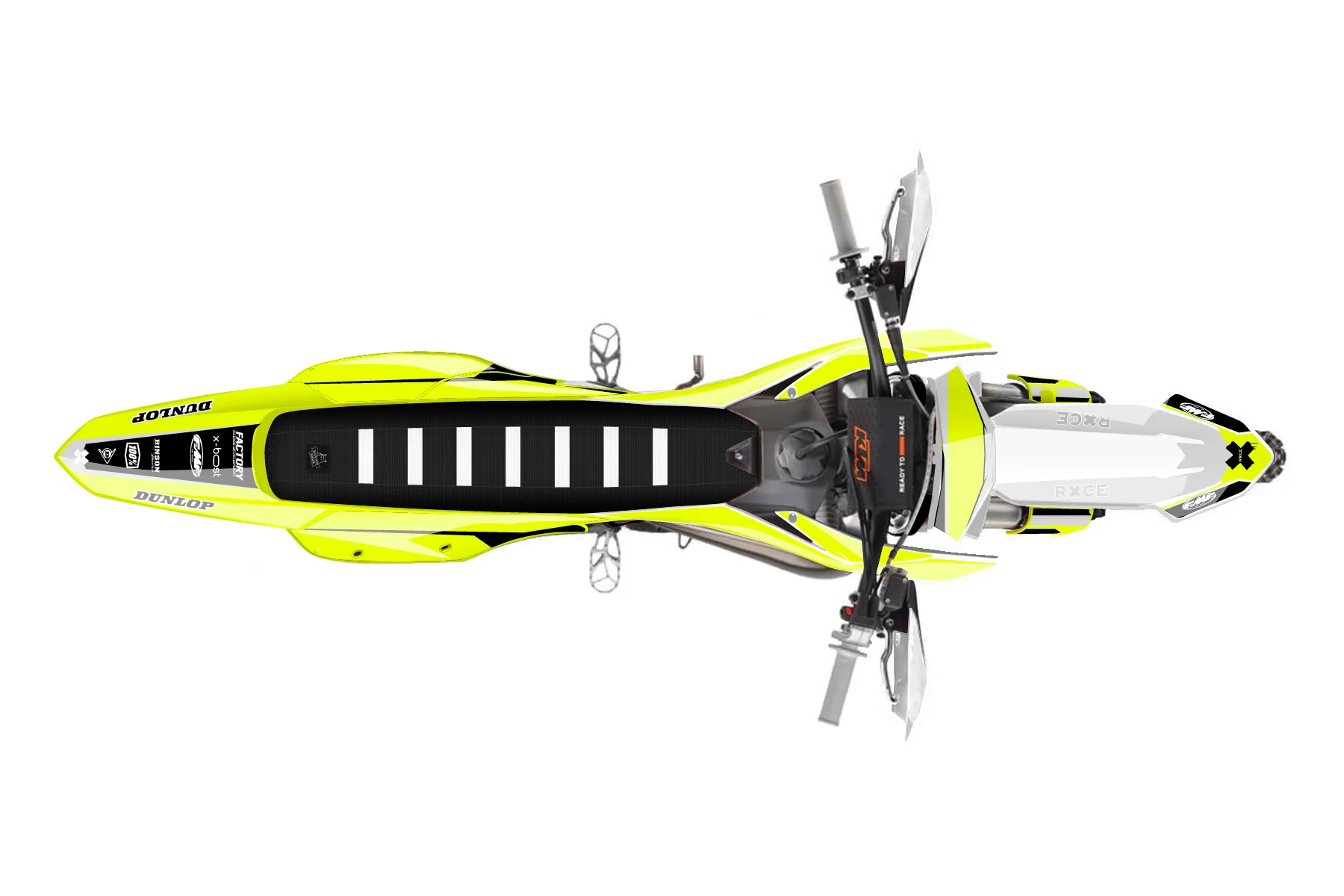 «Ryder Neon» — готовый комплект графики серии Maverick для KTM Offroad Graphic Kit KTM XC 300 2023. В комплекте: графика на бак и боковые облицовки, крылья (переднее и заднее), передний щиток, номерные таблички, защита вилки. Материал: ПВХ-винил 80 мкр с холодной ламинацией 300 мкр, общая толщина 380 мкр; покрытие глянцевое или матовое на выбор. Устойчив к UV-излучению, воде, бензину и мойке высокого давления. Клей акриловый на сольвентной основе — постоянный, для гибких пластиков. На простых поверхностях монтируется без нагрева; для сложных изгибов рекомендуем фен. Этот пресет можно заказать как есть или взять за основу в конструкторе: поменять цвета, добавить стартовый номер и свой бренд. Производство — 3–5 рабочих дней, доставка по России СДЭКом или Почтой, по СНГ — курьерскими службами.