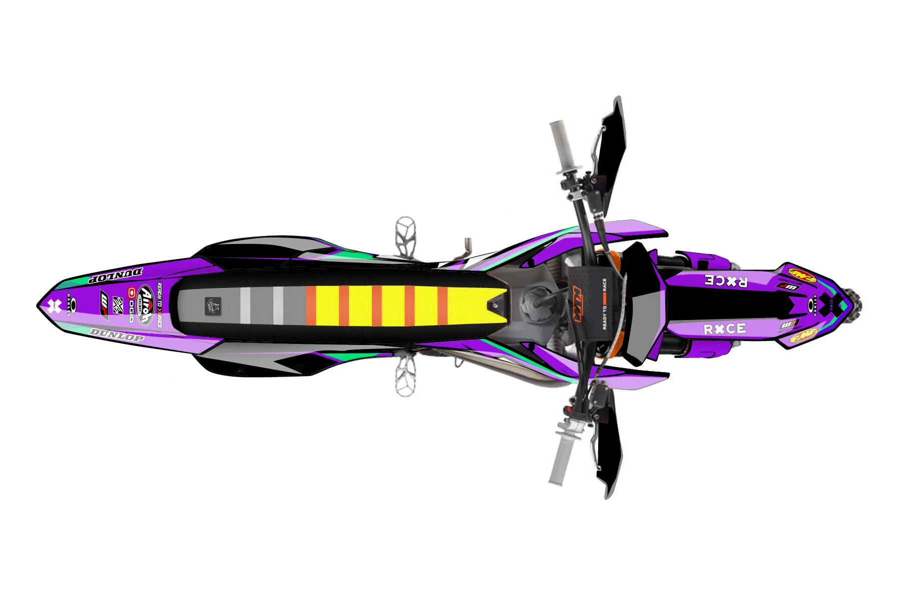 «CustomDesign Purple Teal» — готовый комплект графики серии Staple для KTM Offroad Graphic Kit KTM XC 300 2023. В комплекте: графика на бак и боковые облицовки, крылья (переднее и заднее), передний щиток, номерные таблички, защита вилки. Материал: ПВХ-винил 80 мкр с холодной ламинацией 300 мкр, общая толщина 380 мкр; покрытие глянцевое или матовое на выбор. Устойчив к UV-излучению, воде, бензину и мойке высокого давления. Клей акриловый на сольвентной основе — постоянный, для гибких пластиков. На простых поверхностях монтируется без нагрева; для сложных изгибов рекомендуем фен. Этот пресет можно заказать как есть или взять за основу в конструкторе: поменять цвета, добавить стартовый номер и свой бренд. Производство — 3–5 рабочих дней, доставка по России СДЭКом или Почтой, по СНГ — курьерскими службами.