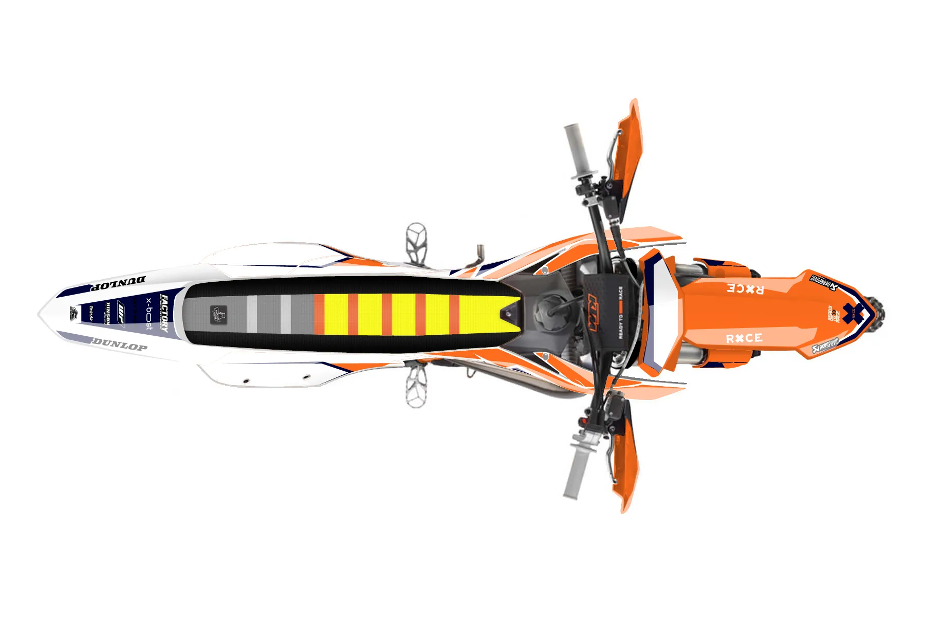 «Swoosh» — готовый комплект графики серии Staple для KTM Offroad Graphic Kit KTM XC 300 2023. В комплекте: графика на бак и боковые облицовки, крылья (переднее и заднее), передний щиток, номерные таблички, защита вилки. Материал: ПВХ-винил 80 мкр с холодной ламинацией 300 мкр, общая толщина 380 мкр; покрытие глянцевое или матовое на выбор. Устойчив к UV-излучению, воде, бензину и мойке высокого давления. Клей акриловый на сольвентной основе — постоянный, для гибких пластиков. На простых поверхностях монтируется без нагрева; для сложных изгибов рекомендуем фен. Этот пресет можно заказать как есть или взять за основу в конструкторе: поменять цвета, добавить стартовый номер и свой бренд. Производство — 3–5 рабочих дней, доставка по России СДЭКом или Почтой, по СНГ — курьерскими службами.