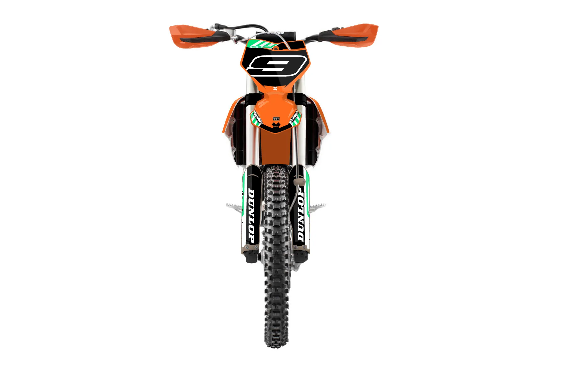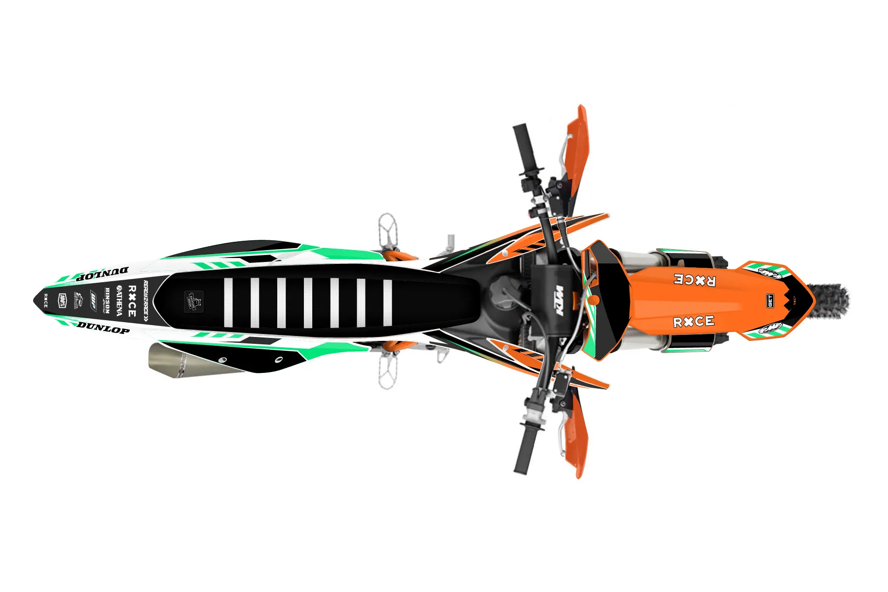«Future» — готовый комплект графики серии Maverick для KTM Offroad Graphic Kit KTM XC-F 250 2019. В комплекте: графика на бак и боковые облицовки, крылья (переднее и заднее), передний щиток, номерные таблички, защита вилки. Материал: ПВХ-винил 80 мкр с холодной ламинацией 300 мкр, общая толщина 380 мкр; покрытие глянцевое или матовое на выбор. Устойчив к UV-излучению, воде, бензину и мойке высокого давления. Клей акриловый на сольвентной основе — постоянный, для гибких пластиков. На простых поверхностях монтируется без нагрева; для сложных изгибов рекомендуем фен. Этот пресет можно заказать как есть или взять за основу в конструкторе: поменять цвета, добавить стартовый номер и свой бренд. Производство — 3–5 рабочих дней, доставка по России СДЭКом или Почтой, по СНГ — курьерскими службами.