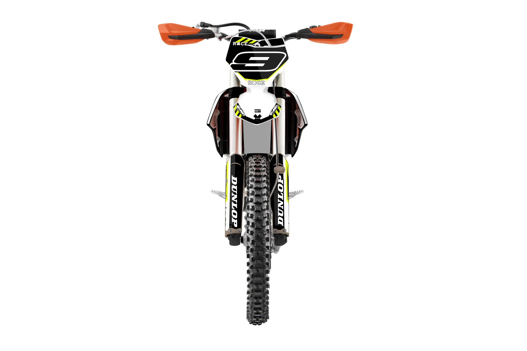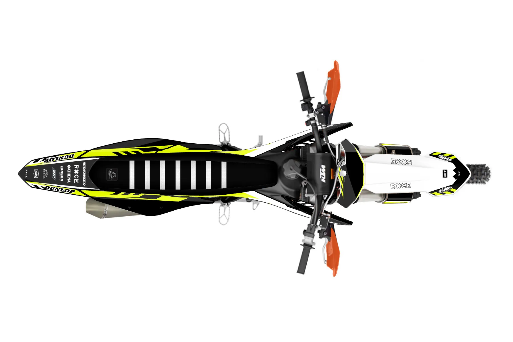 «Grip Neon» — готовый комплект графики серии Maverick для KTM Offroad Graphic Kit KTM XC-F 250 2019. В комплекте: графика на бак и боковые облицовки, крылья (переднее и заднее), передний щиток, номерные таблички, защита вилки. Материал: ПВХ-винил 80 мкр с холодной ламинацией 300 мкр, общая толщина 380 мкр; покрытие глянцевое или матовое на выбор. Устойчив к UV-излучению, воде, бензину и мойке высокого давления. Клей акриловый на сольвентной основе — постоянный, для гибких пластиков. На простых поверхностях монтируется без нагрева; для сложных изгибов рекомендуем фен. Этот пресет можно заказать как есть или взять за основу в конструкторе: поменять цвета, добавить стартовый номер и свой бренд. Производство — 3–5 рабочих дней, доставка по России СДЭКом или Почтой, по СНГ — курьерскими службами.