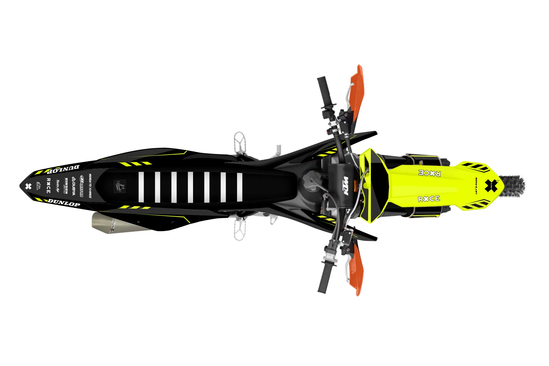 «Kitted Neon» — готовый комплект графики серии Maverick для KTM Offroad Graphic Kit KTM XC-F 250 2019. В комплекте: графика на бак и боковые облицовки, крылья (переднее и заднее), передний щиток, номерные таблички, защита вилки. Материал: ПВХ-винил 80 мкр с холодной ламинацией 300 мкр, общая толщина 380 мкр; покрытие глянцевое или матовое на выбор. Устойчив к UV-излучению, воде, бензину и мойке высокого давления. Клей акриловый на сольвентной основе — постоянный, для гибких пластиков. На простых поверхностях монтируется без нагрева; для сложных изгибов рекомендуем фен. Этот пресет можно заказать как есть или взять за основу в конструкторе: поменять цвета, добавить стартовый номер и свой бренд. Производство — 3–5 рабочих дней, доставка по России СДЭКом или Почтой, по СНГ — курьерскими службами.