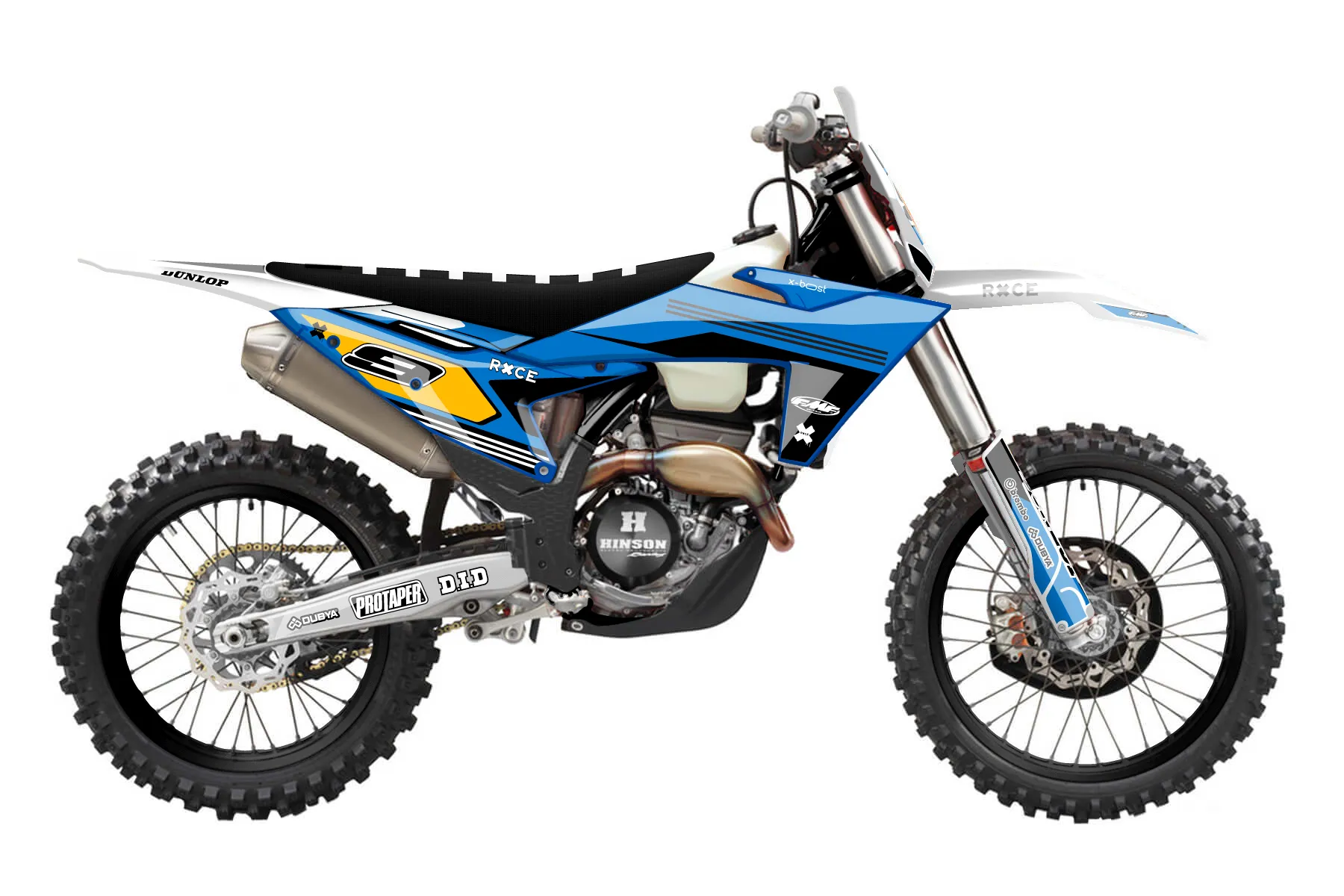 «All-Star» — готовый комплект графики серии Flow для KTM Offroad Graphic Kit KTM XC-F 250 2023. В комплекте: графика на бак и боковые облицовки, крылья (переднее и заднее), передний щиток, номерные таблички, защита вилки. Материал: ПВХ-винил 80 мкр с холодной ламинацией 300 мкр, общая толщина 380 мкр; покрытие глянцевое или матовое на выбор. Устойчив к UV-излучению, воде, бензину и мойке высокого давления. Клей акриловый на сольвентной основе — постоянный, для гибких пластиков. На простых поверхностях монтируется без нагрева; для сложных изгибов рекомендуем фен. Этот пресет можно заказать как есть или взять за основу в конструкторе: поменять цвета, добавить стартовый номер и свой бренд. Производство — 3–5 рабочих дней, доставка по России СДЭКом или Почтой, по СНГ — курьерскими службами.