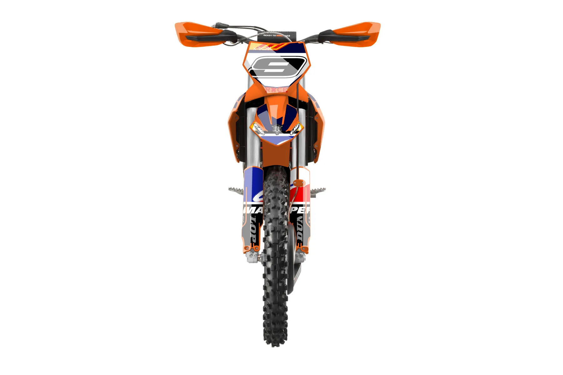«CustomDesign» — готовый комплект графики серии Maverick для KTM Offroad Graphic Kit KTM XC-F 250 2023. В комплекте: графика на бак и боковые облицовки, крылья (переднее и заднее), передний щиток, номерные таблички, защита вилки. Материал: ПВХ-винил 80 мкр с холодной ламинацией 300 мкр, общая толщина 380 мкр; покрытие глянцевое или матовое на выбор. Устойчив к UV-излучению, воде, бензину и мойке высокого давления. Клей акриловый на сольвентной основе — постоянный, для гибких пластиков. На простых поверхностях монтируется без нагрева; для сложных изгибов рекомендуем фен. Этот пресет можно заказать как есть или взять за основу в конструкторе: поменять цвета, добавить стартовый номер и свой бренд. Производство — 3–5 рабочих дней, доставка по России СДЭКом или Почтой, по СНГ — курьерскими службами.