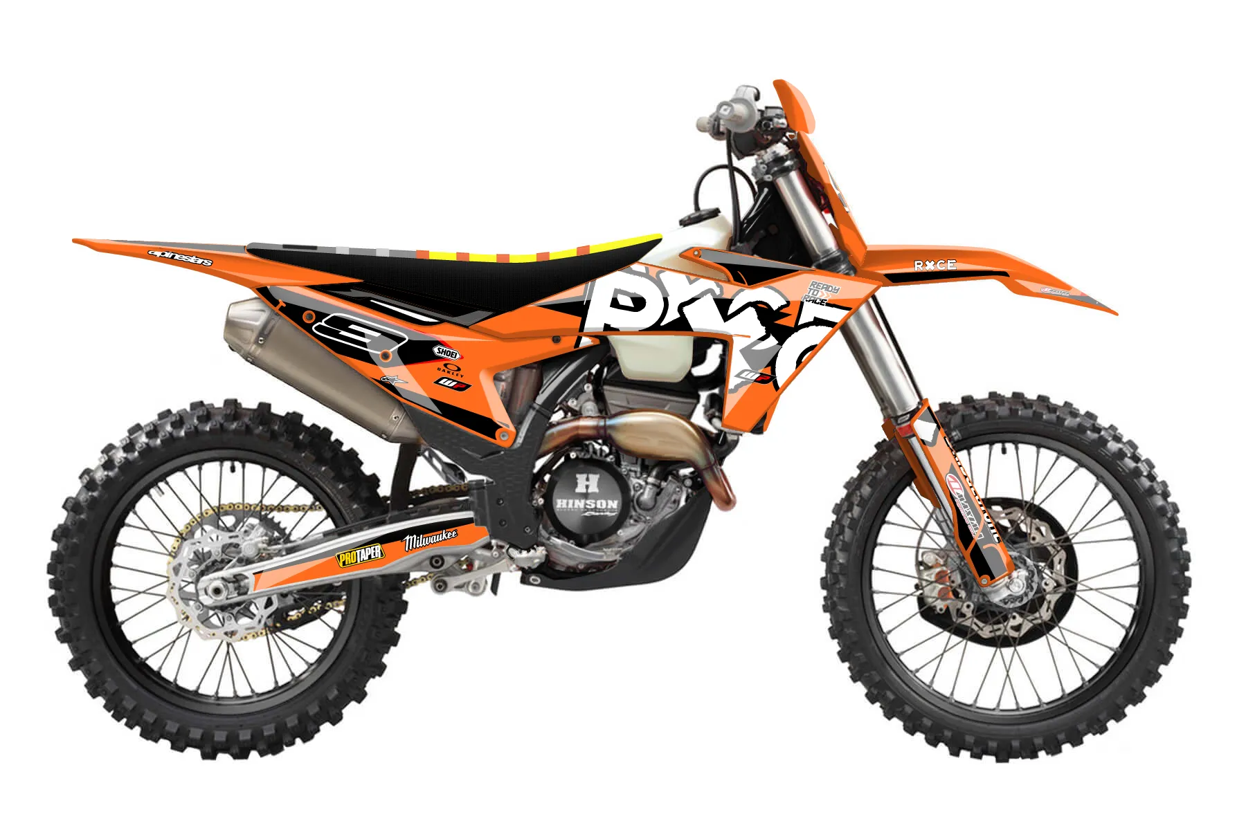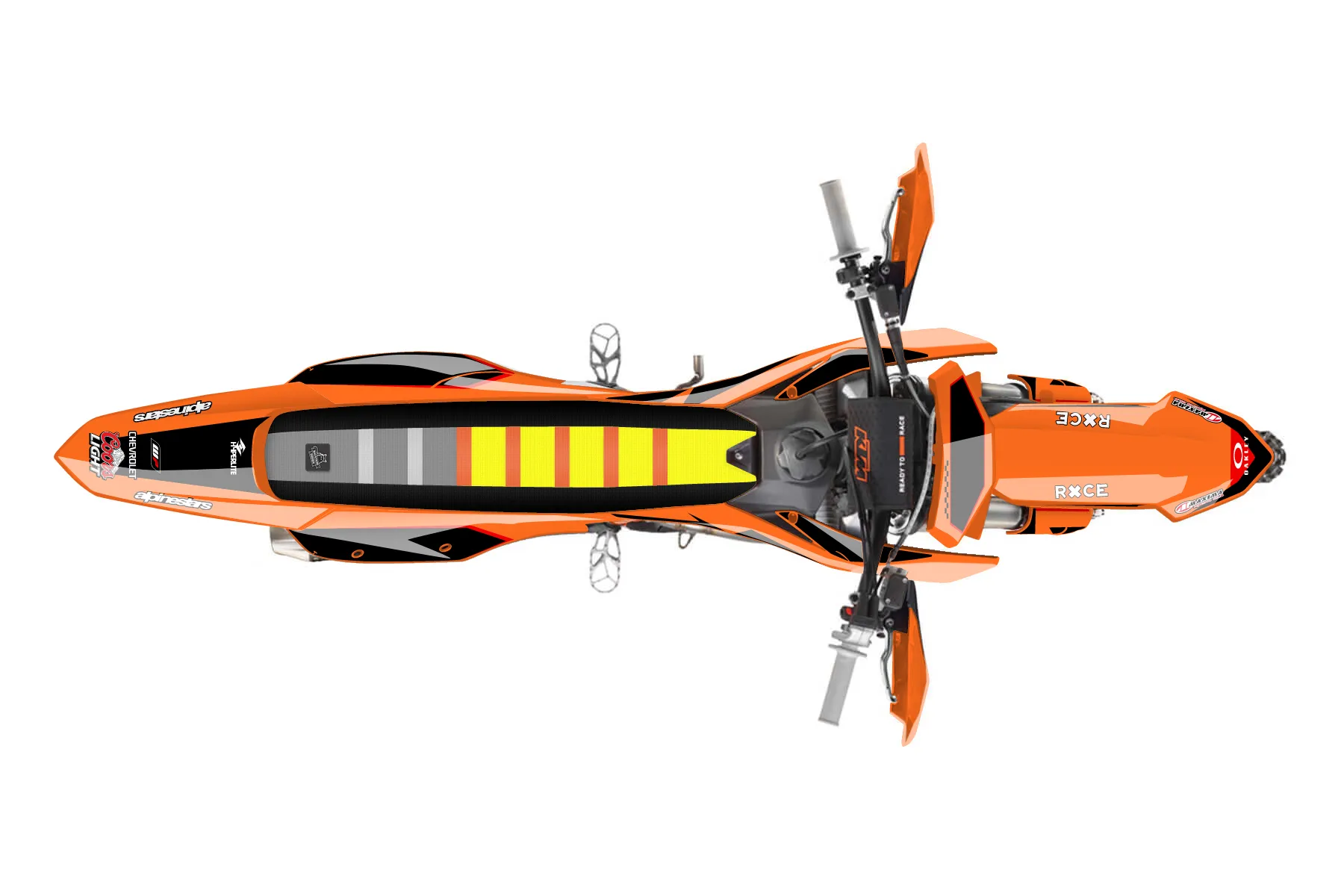 «Custo14mDesign» — готовый комплект графики серии Staple для KTM Offroad Graphic Kit KTM XC-F 250 2023. В комплекте: графика на бак и боковые облицовки, крылья (переднее и заднее), передний щиток, номерные таблички, защита вилки. Материал: ПВХ-винил 80 мкр с холодной ламинацией 300 мкр, общая толщина 380 мкр; покрытие глянцевое или матовое на выбор. Устойчив к UV-излучению, воде, бензину и мойке высокого давления. Клей акриловый на сольвентной основе — постоянный, для гибких пластиков. На простых поверхностях монтируется без нагрева; для сложных изгибов рекомендуем фен. Этот пресет можно заказать как есть или взять за основу в конструкторе: поменять цвета, добавить стартовый номер и свой бренд. Производство — 3–5 рабочих дней, доставка по России СДЭКом или Почтой, по СНГ — курьерскими службами.