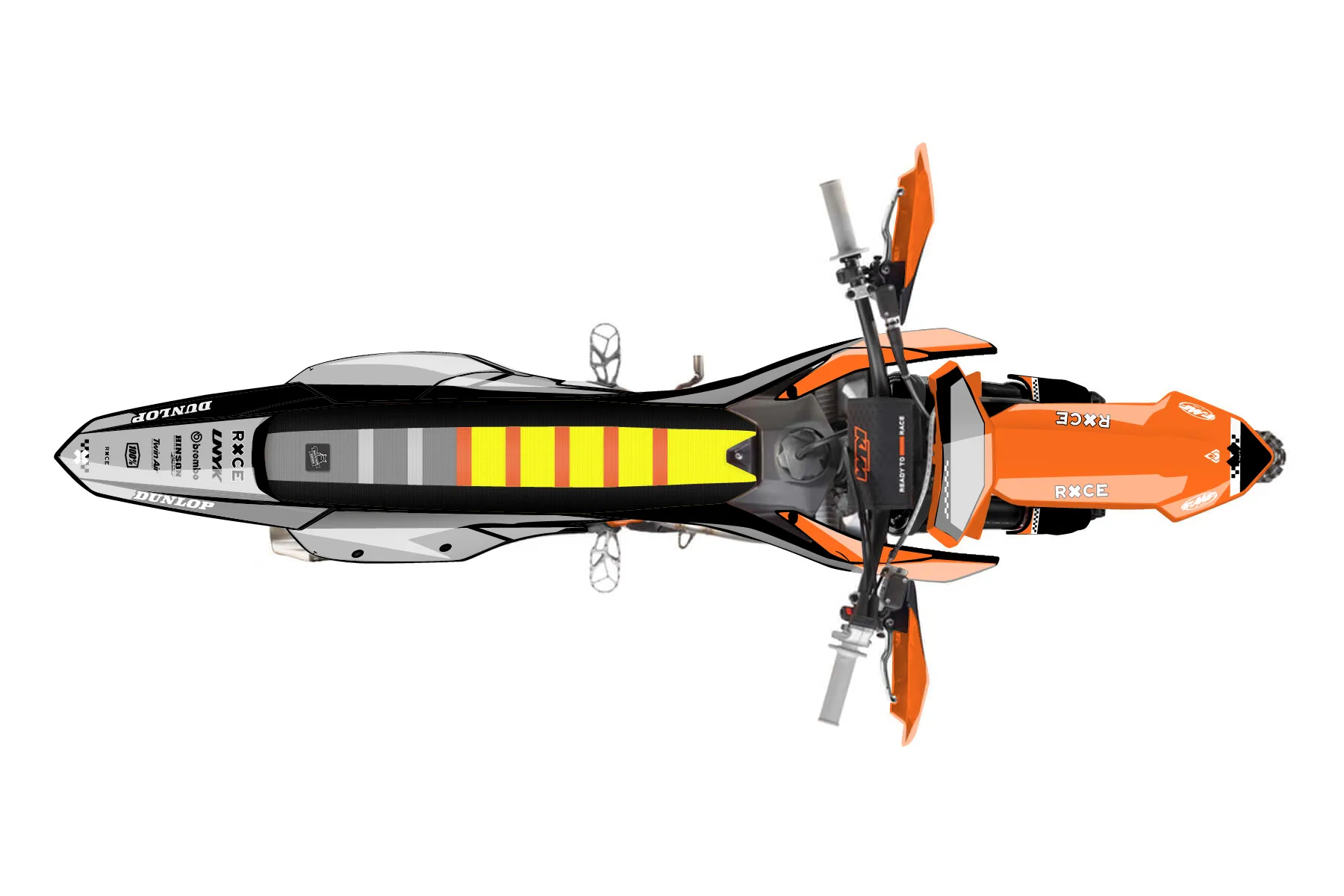 «Groove» — готовый комплект графики серии Staple для KTM Offroad Graphic Kit KTM XC-F 250 2023. В комплекте: графика на бак и боковые облицовки, крылья (переднее и заднее), передний щиток, номерные таблички, защита вилки. Материал: ПВХ-винил 80 мкр с холодной ламинацией 300 мкр, общая толщина 380 мкр; покрытие глянцевое или матовое на выбор. Устойчив к UV-излучению, воде, бензину и мойке высокого давления. Клей акриловый на сольвентной основе — постоянный, для гибких пластиков. На простых поверхностях монтируется без нагрева; для сложных изгибов рекомендуем фен. Этот пресет можно заказать как есть или взять за основу в конструкторе: поменять цвета, добавить стартовый номер и свой бренд. Производство — 3–5 рабочих дней, доставка по России СДЭКом или Почтой, по СНГ — курьерскими службами.