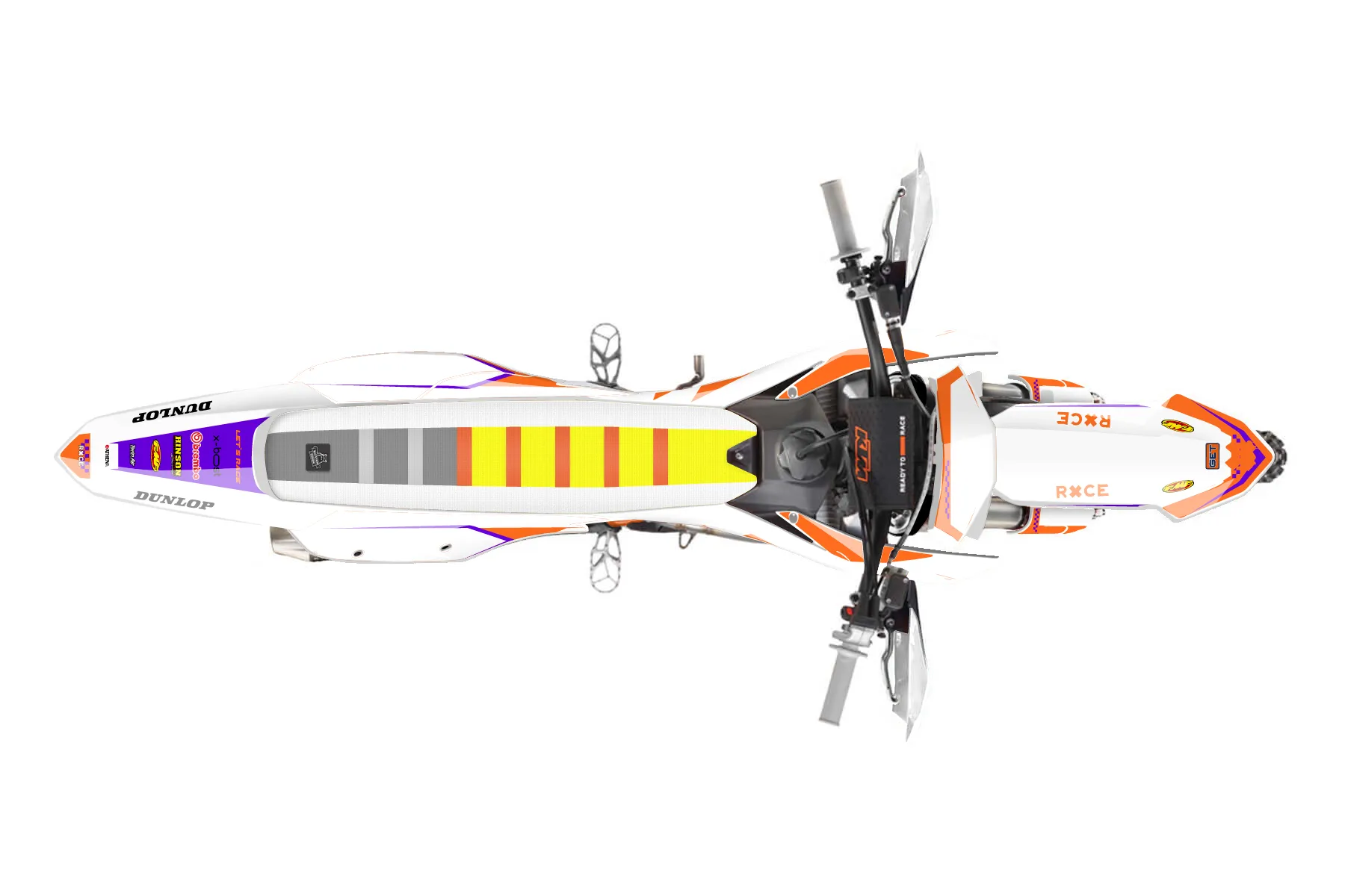 «Retro» — готовый комплект графики серии Staple для KTM Offroad Graphic Kit KTM XC-F 250 2023. В комплекте: графика на бак и боковые облицовки, крылья (переднее и заднее), передний щиток, номерные таблички, защита вилки. Материал: ПВХ-винил 80 мкр с холодной ламинацией 300 мкр, общая толщина 380 мкр; покрытие глянцевое или матовое на выбор. Устойчив к UV-излучению, воде, бензину и мойке высокого давления. Клей акриловый на сольвентной основе — постоянный, для гибких пластиков. На простых поверхностях монтируется без нагрева; для сложных изгибов рекомендуем фен. Этот пресет можно заказать как есть или взять за основу в конструкторе: поменять цвета, добавить стартовый номер и свой бренд. Производство — 3–5 рабочих дней, доставка по России СДЭКом или Почтой, по СНГ — курьерскими службами.
