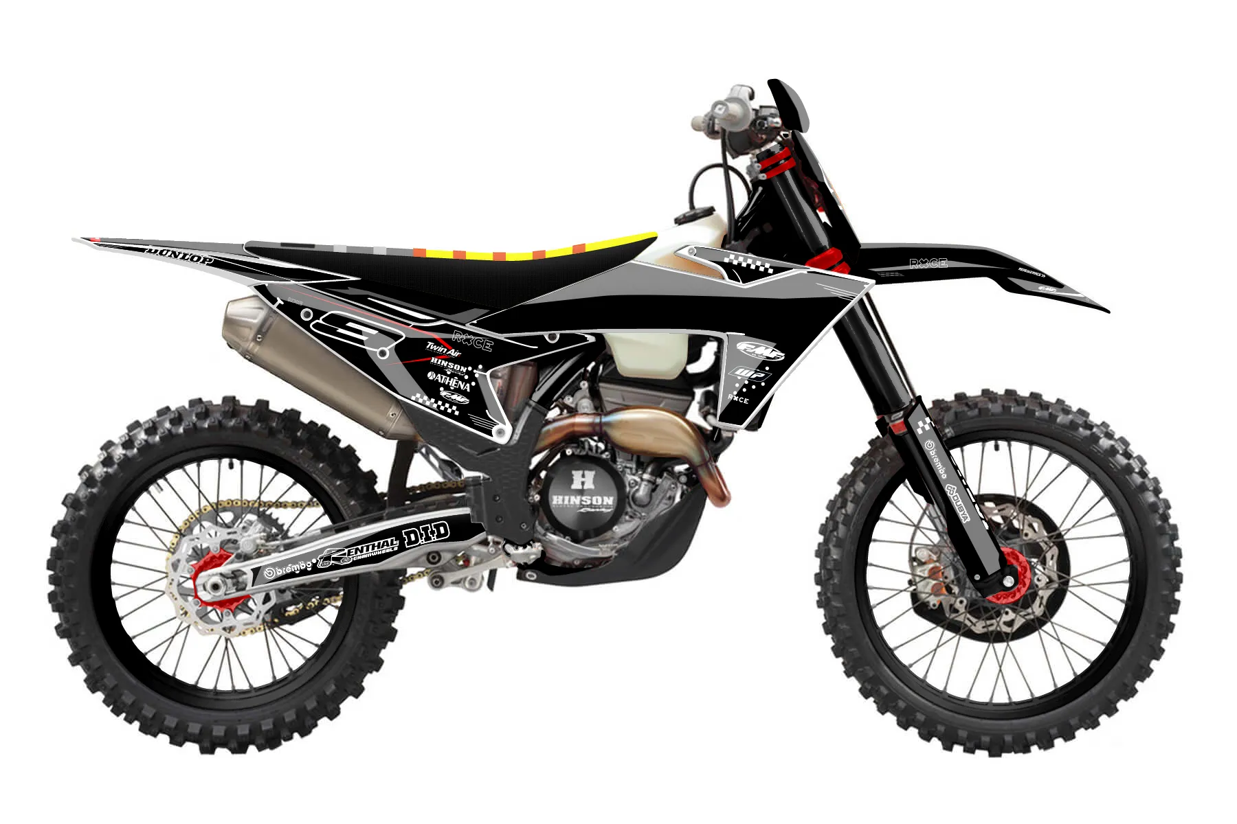 «Tack» — готовый комплект графики серии Staple для KTM Offroad Graphic Kit KTM XC-F 250 2023. В комплекте: графика на бак и боковые облицовки, крылья (переднее и заднее), передний щиток, номерные таблички, защита вилки. Материал: ПВХ-винил 80 мкр с холодной ламинацией 300 мкр, общая толщина 380 мкр; покрытие глянцевое или матовое на выбор. Устойчив к UV-излучению, воде, бензину и мойке высокого давления. Клей акриловый на сольвентной основе — постоянный, для гибких пластиков. На простых поверхностях монтируется без нагрева; для сложных изгибов рекомендуем фен. Этот пресет можно заказать как есть или взять за основу в конструкторе: поменять цвета, добавить стартовый номер и свой бренд. Производство — 3–5 рабочих дней, доставка по России СДЭКом или Почтой, по СНГ — курьерскими службами.