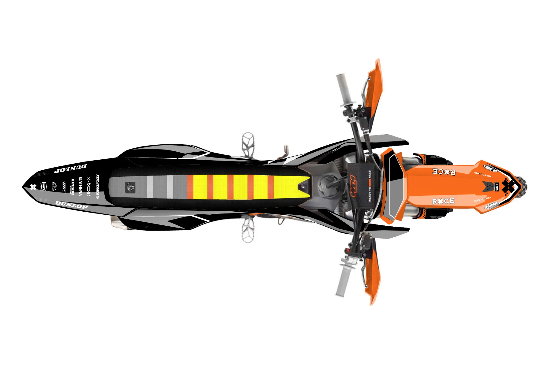 «Thrill» — готовый комплект графики серии Staple для KTM Offroad Graphic Kit KTM XC-F 250 2023. В комплекте: графика на бак и боковые облицовки, крылья (переднее и заднее), передний щиток, номерные таблички, защита вилки. Материал: ПВХ-винил 80 мкр с холодной ламинацией 300 мкр, общая толщина 380 мкр; покрытие глянцевое или матовое на выбор. Устойчив к UV-излучению, воде, бензину и мойке высокого давления. Клей акриловый на сольвентной основе — постоянный, для гибких пластиков. На простых поверхностях монтируется без нагрева; для сложных изгибов рекомендуем фен. Этот пресет можно заказать как есть или взять за основу в конструкторе: поменять цвета, добавить стартовый номер и свой бренд. Производство — 3–5 рабочих дней, доставка по России СДЭКом или Почтой, по СНГ — курьерскими службами.