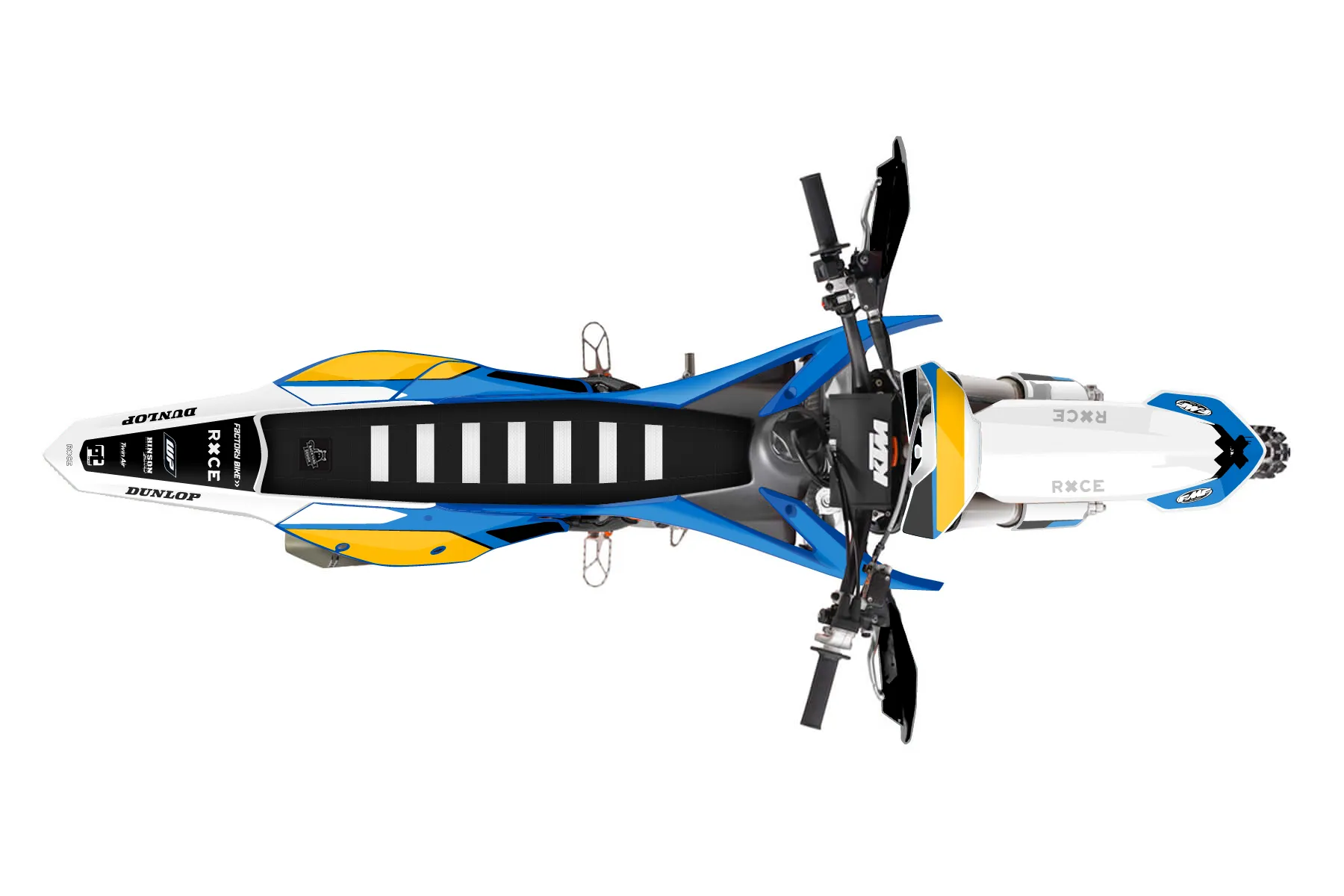 «All-Star» — готовый комплект графики серии Flow для KTM Offroad Graphic Kit KTM XC-F 350 2016. В комплекте: графика на бак и боковые облицовки, крылья (переднее и заднее), передний щиток, номерные таблички, защита вилки. Материал: ПВХ-винил 80 мкр с холодной ламинацией 300 мкр, общая толщина 380 мкр; покрытие глянцевое или матовое на выбор. Устойчив к UV-излучению, воде, бензину и мойке высокого давления. Клей акриловый на сольвентной основе — постоянный, для гибких пластиков. На простых поверхностях монтируется без нагрева; для сложных изгибов рекомендуем фен. Этот пресет можно заказать как есть или взять за основу в конструкторе: поменять цвета, добавить стартовый номер и свой бренд. Производство — 3–5 рабочих дней, доставка по России СДЭКом или Почтой, по СНГ — курьерскими службами.