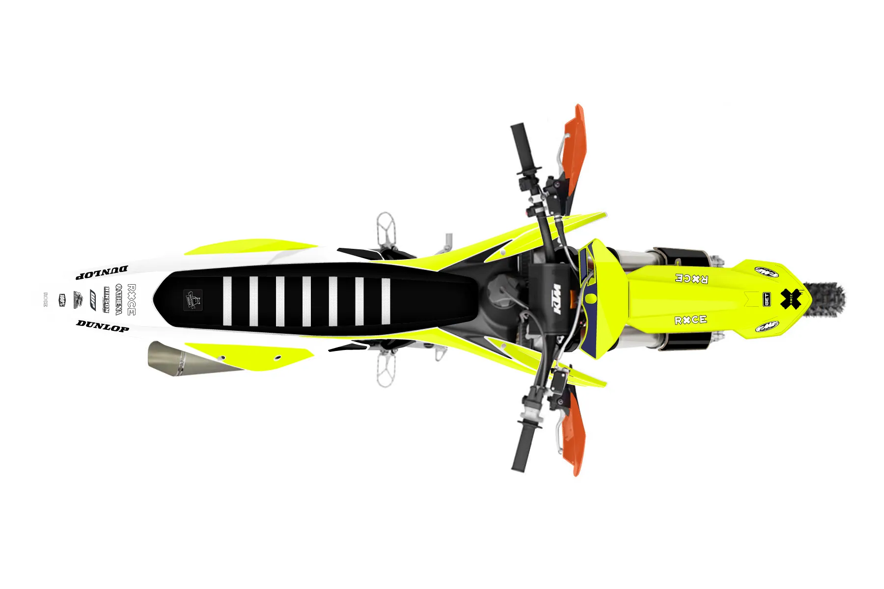 «Rise Fluo» — готовый комплект графики серии Flow для KTM Offroad Graphic Kit KTM XC-F 350 2019. В комплекте: графика на бак и боковые облицовки, крылья (переднее и заднее), передний щиток, номерные таблички, защита вилки. Материал: ПВХ-винил 80 мкр с холодной ламинацией 300 мкр, общая толщина 380 мкр; покрытие глянцевое или матовое на выбор. Устойчив к UV-излучению, воде, бензину и мойке высокого давления. Клей акриловый на сольвентной основе — постоянный, для гибких пластиков. На простых поверхностях монтируется без нагрева; для сложных изгибов рекомендуем фен. Этот пресет можно заказать как есть или взять за основу в конструкторе: поменять цвета, добавить стартовый номер и свой бренд. Производство — 3–5 рабочих дней, доставка по России СДЭКом или Почтой, по СНГ — курьерскими службами.