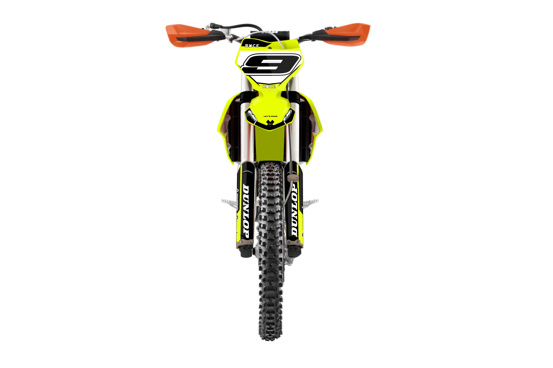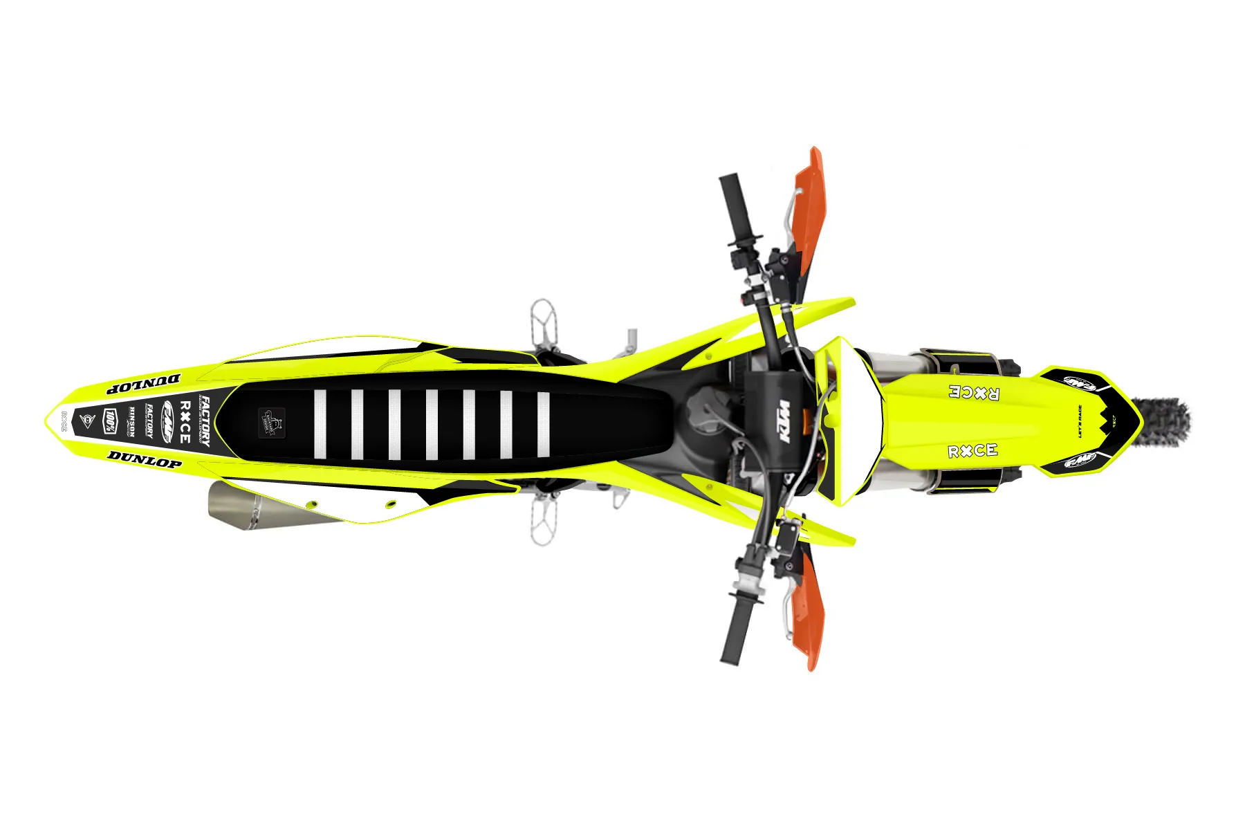 «Bright Neon» — готовый комплект графики серии Maverick для KTM Offroad Graphic Kit KTM XC-F 350 2019. В комплекте: графика на бак и боковые облицовки, крылья (переднее и заднее), передний щиток, номерные таблички, защита вилки. Материал: ПВХ-винил 80 мкр с холодной ламинацией 300 мкр, общая толщина 380 мкр; покрытие глянцевое или матовое на выбор. Устойчив к UV-излучению, воде, бензину и мойке высокого давления. Клей акриловый на сольвентной основе — постоянный, для гибких пластиков. На простых поверхностях монтируется без нагрева; для сложных изгибов рекомендуем фен. Этот пресет можно заказать как есть или взять за основу в конструкторе: поменять цвета, добавить стартовый номер и свой бренд. Производство — 3–5 рабочих дней, доставка по России СДЭКом или Почтой, по СНГ — курьерскими службами.