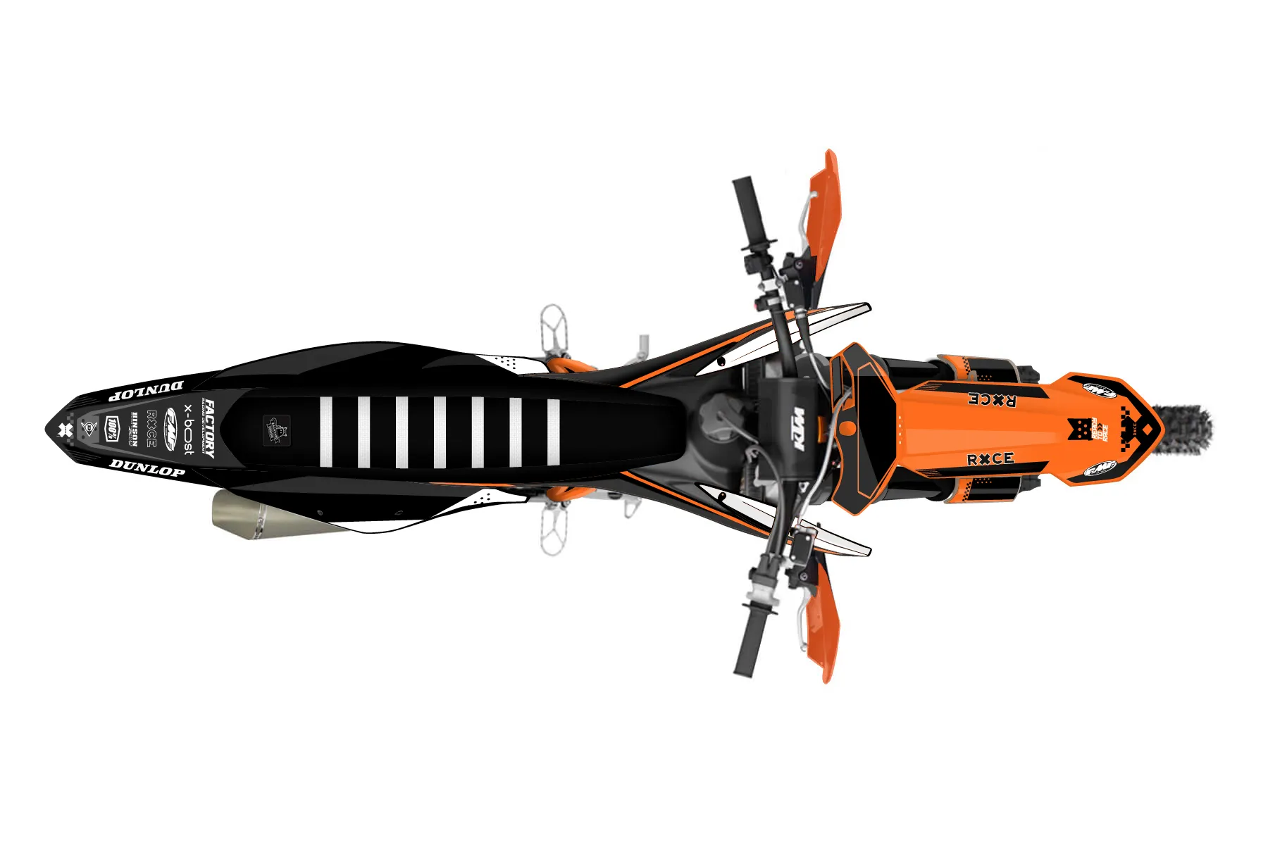 «RacerX» — готовый комплект графики серии Staple для KTM Offroad Graphic Kit KTM XC-F 350 2019. В комплекте: графика на бак и боковые облицовки, крылья (переднее и заднее), передний щиток, номерные таблички, защита вилки. Материал: ПВХ-винил 80 мкр с холодной ламинацией 300 мкр, общая толщина 380 мкр; покрытие глянцевое или матовое на выбор. Устойчив к UV-излучению, воде, бензину и мойке высокого давления. Клей акриловый на сольвентной основе — постоянный, для гибких пластиков. На простых поверхностях монтируется без нагрева; для сложных изгибов рекомендуем фен. Этот пресет можно заказать как есть или взять за основу в конструкторе: поменять цвета, добавить стартовый номер и свой бренд. Производство — 3–5 рабочих дней, доставка по России СДЭКом или Почтой, по СНГ — курьерскими службами.