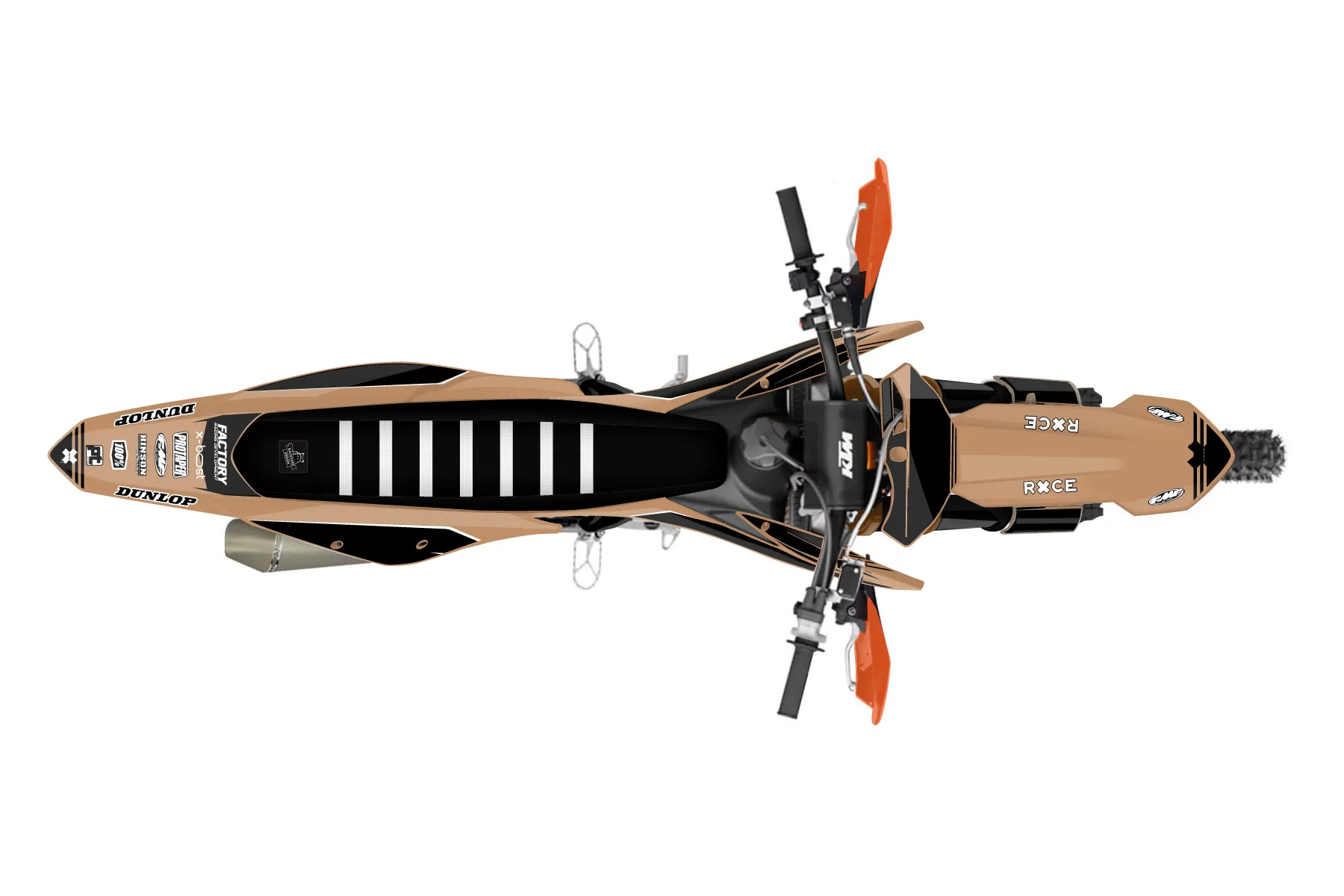 «Entire» — готовый комплект графики серии Untucked для KTM Offroad Graphic Kit KTM XC-F 350 2019. В комплекте: графика на бак и боковые облицовки, крылья (переднее и заднее), передний щиток, номерные таблички, защита вилки. Материал: ПВХ-винил 80 мкр с холодной ламинацией 300 мкр, общая толщина 380 мкр; покрытие глянцевое или матовое на выбор. Устойчив к UV-излучению, воде, бензину и мойке высокого давления. Клей акриловый на сольвентной основе — постоянный, для гибких пластиков. На простых поверхностях монтируется без нагрева; для сложных изгибов рекомендуем фен. Этот пресет можно заказать как есть или взять за основу в конструкторе: поменять цвета, добавить стартовый номер и свой бренд. Производство — 3–5 рабочих дней, доставка по России СДЭКом или Почтой, по СНГ — курьерскими службами.