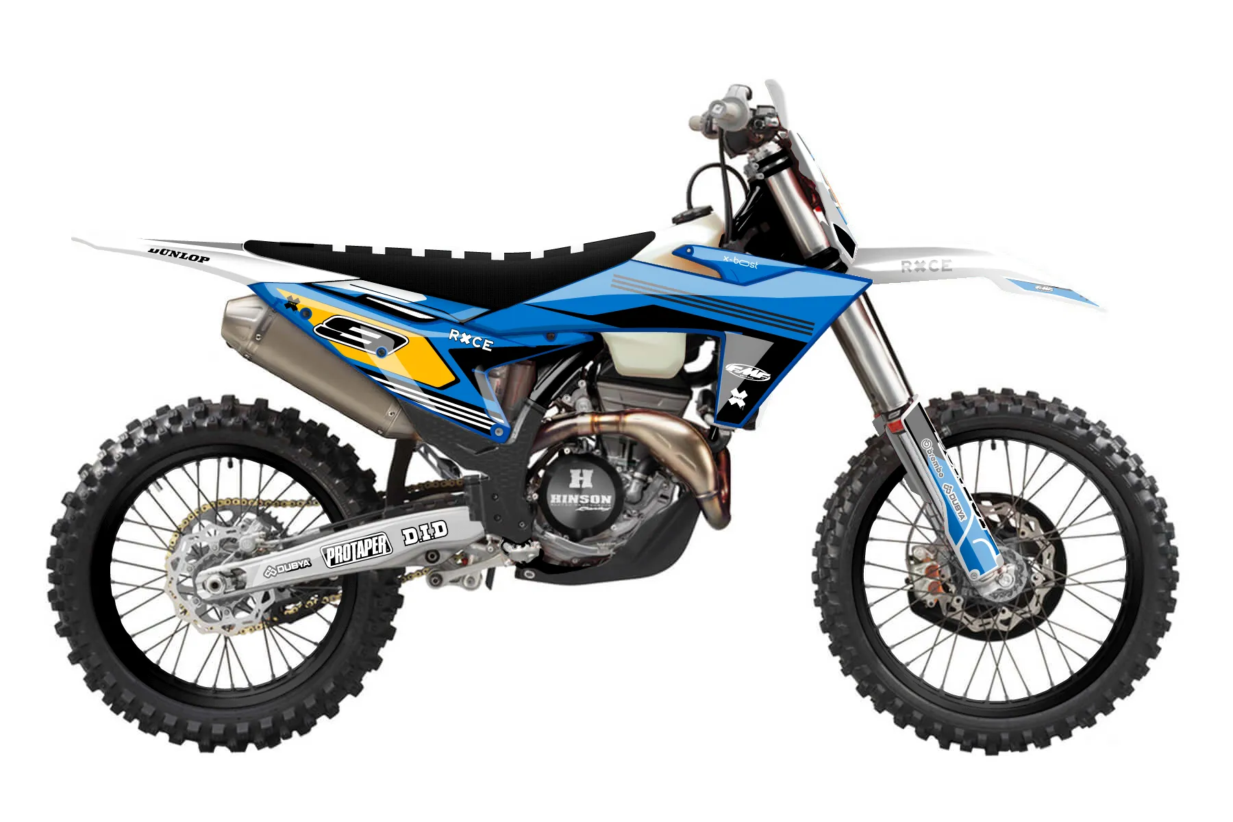 «All-Star» — готовый комплект графики серии Flow для KTM Offroad Graphic Kit KTM XC-F 350 2023. В комплекте: графика на бак и боковые облицовки, крылья (переднее и заднее), передний щиток, номерные таблички, защита вилки. Материал: ПВХ-винил 80 мкр с холодной ламинацией 300 мкр, общая толщина 380 мкр; покрытие глянцевое или матовое на выбор. Устойчив к UV-излучению, воде, бензину и мойке высокого давления. Клей акриловый на сольвентной основе — постоянный, для гибких пластиков. На простых поверхностях монтируется без нагрева; для сложных изгибов рекомендуем фен. Этот пресет можно заказать как есть или взять за основу в конструкторе: поменять цвета, добавить стартовый номер и свой бренд. Производство — 3–5 рабочих дней, доставка по России СДЭКом или Почтой, по СНГ — курьерскими службами.