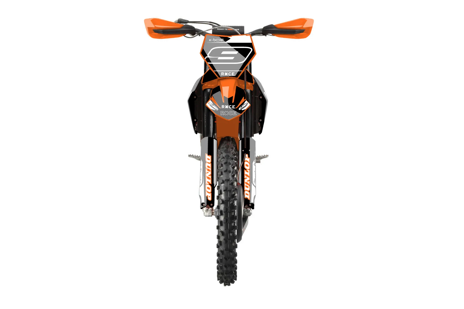«Race» — готовый комплект графики серии Flow для KTM Offroad Graphic Kit KTM XC-F 350 2023. В комплекте: графика на бак и боковые облицовки, крылья (переднее и заднее), передний щиток, номерные таблички, защита вилки. Материал: ПВХ-винил 80 мкр с холодной ламинацией 300 мкр, общая толщина 380 мкр; покрытие глянцевое или матовое на выбор. Устойчив к UV-излучению, воде, бензину и мойке высокого давления. Клей акриловый на сольвентной основе — постоянный, для гибких пластиков. На простых поверхностях монтируется без нагрева; для сложных изгибов рекомендуем фен. Этот пресет можно заказать как есть или взять за основу в конструкторе: поменять цвета, добавить стартовый номер и свой бренд. Производство — 3–5 рабочих дней, доставка по России СДЭКом или Почтой, по СНГ — курьерскими службами.