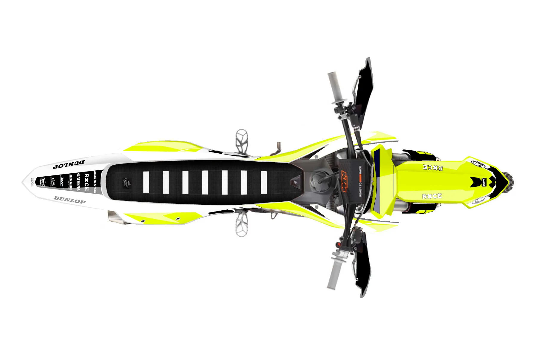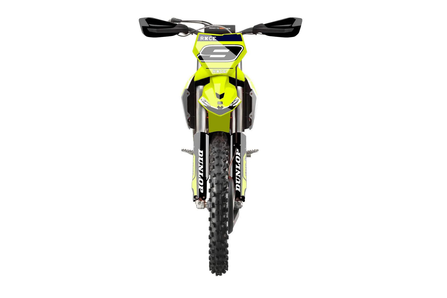 «Rise Fluo» — готовый комплект графики серии Flow для KTM Offroad Graphic Kit KTM XC-F 350 2023. В комплекте: графика на бак и боковые облицовки, крылья (переднее и заднее), передний щиток, номерные таблички, защита вилки. Материал: ПВХ-винил 80 мкр с холодной ламинацией 300 мкр, общая толщина 380 мкр; покрытие глянцевое или матовое на выбор. Устойчив к UV-излучению, воде, бензину и мойке высокого давления. Клей акриловый на сольвентной основе — постоянный, для гибких пластиков. На простых поверхностях монтируется без нагрева; для сложных изгибов рекомендуем фен. Этот пресет можно заказать как есть или взять за основу в конструкторе: поменять цвета, добавить стартовый номер и свой бренд. Производство — 3–5 рабочих дней, доставка по России СДЭКом или Почтой, по СНГ — курьерскими службами.