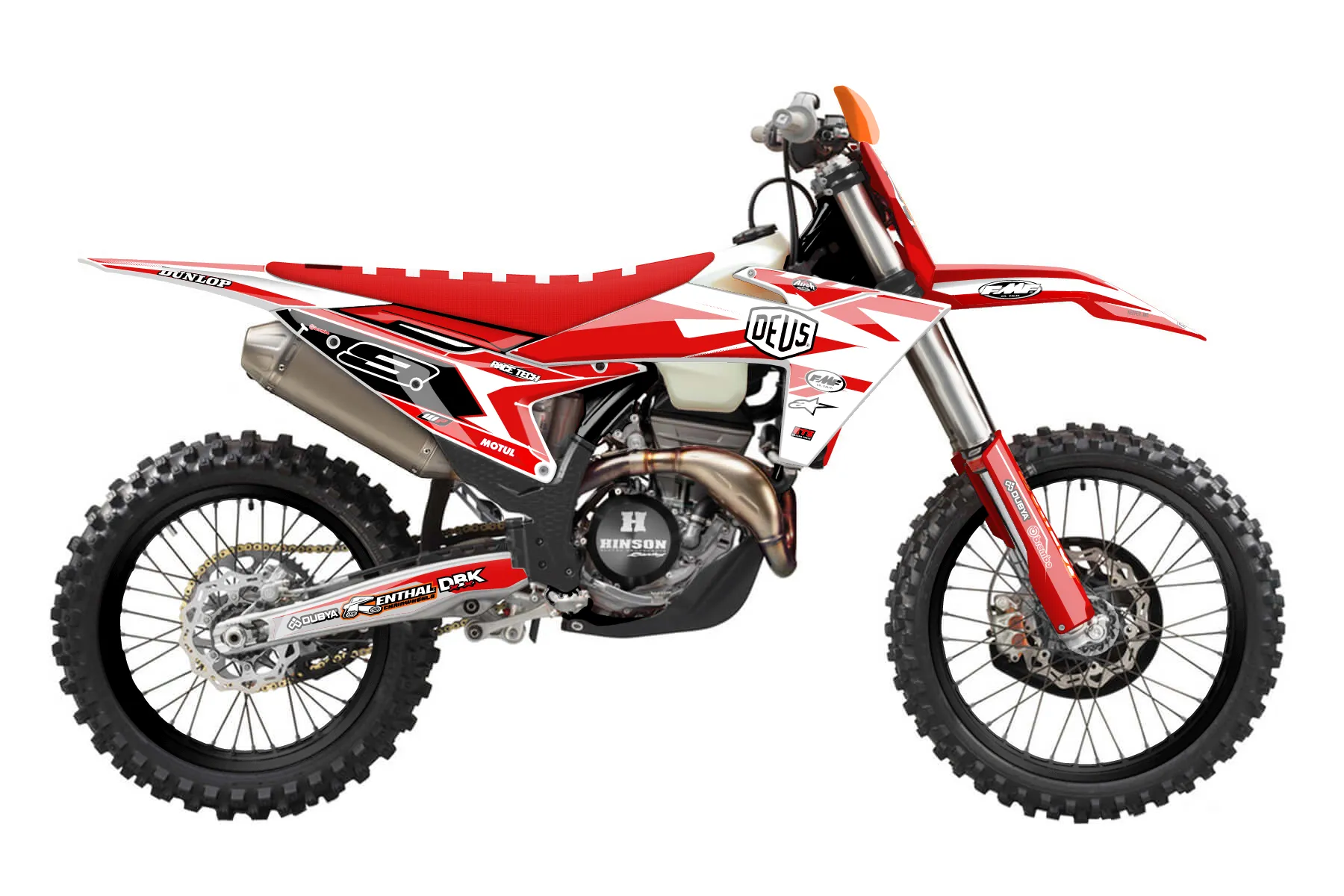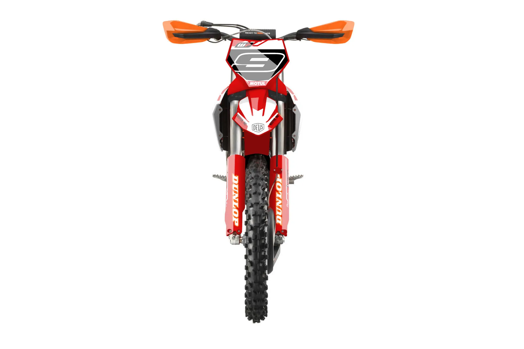 «gasgasred» — готовый комплект графики серии Maverick для KTM Offroad Graphic Kit KTM XC-F 350 2023. В комплекте: графика на бак и боковые облицовки, крылья (переднее и заднее), передний щиток, номерные таблички, защита вилки. Материал: ПВХ-винил 80 мкр с холодной ламинацией 300 мкр, общая толщина 380 мкр; покрытие глянцевое или матовое на выбор. Устойчив к UV-излучению, воде, бензину и мойке высокого давления. Клей акриловый на сольвентной основе — постоянный, для гибких пластиков. На простых поверхностях монтируется без нагрева; для сложных изгибов рекомендуем фен. Этот пресет можно заказать как есть или взять за основу в конструкторе: поменять цвета, добавить стартовый номер и свой бренд. Производство — 3–5 рабочих дней, доставка по России СДЭКом или Почтой, по СНГ — курьерскими службами.