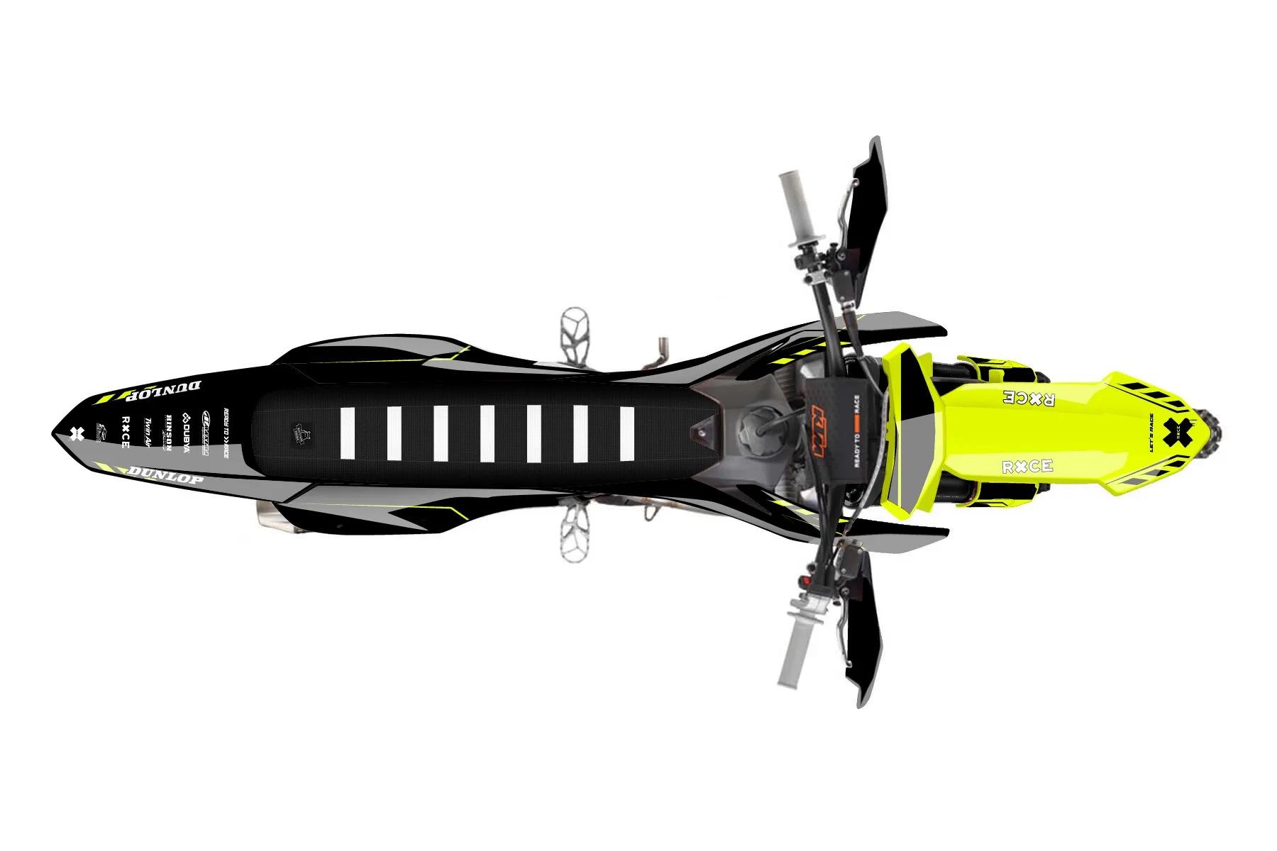 «Kitted Neon» — готовый комплект графики серии Maverick для KTM Offroad Graphic Kit KTM XC-F 350 2023. В комплекте: графика на бак и боковые облицовки, крылья (переднее и заднее), передний щиток, номерные таблички, защита вилки. Материал: ПВХ-винил 80 мкр с холодной ламинацией 300 мкр, общая толщина 380 мкр; покрытие глянцевое или матовое на выбор. Устойчив к UV-излучению, воде, бензину и мойке высокого давления. Клей акриловый на сольвентной основе — постоянный, для гибких пластиков. На простых поверхностях монтируется без нагрева; для сложных изгибов рекомендуем фен. Этот пресет можно заказать как есть или взять за основу в конструкторе: поменять цвета, добавить стартовый номер и свой бренд. Производство — 3–5 рабочих дней, доставка по России СДЭКом или Почтой, по СНГ — курьерскими службами.