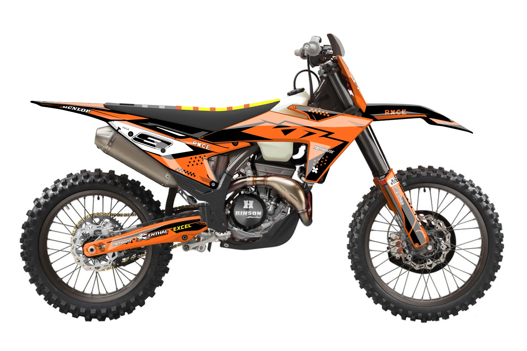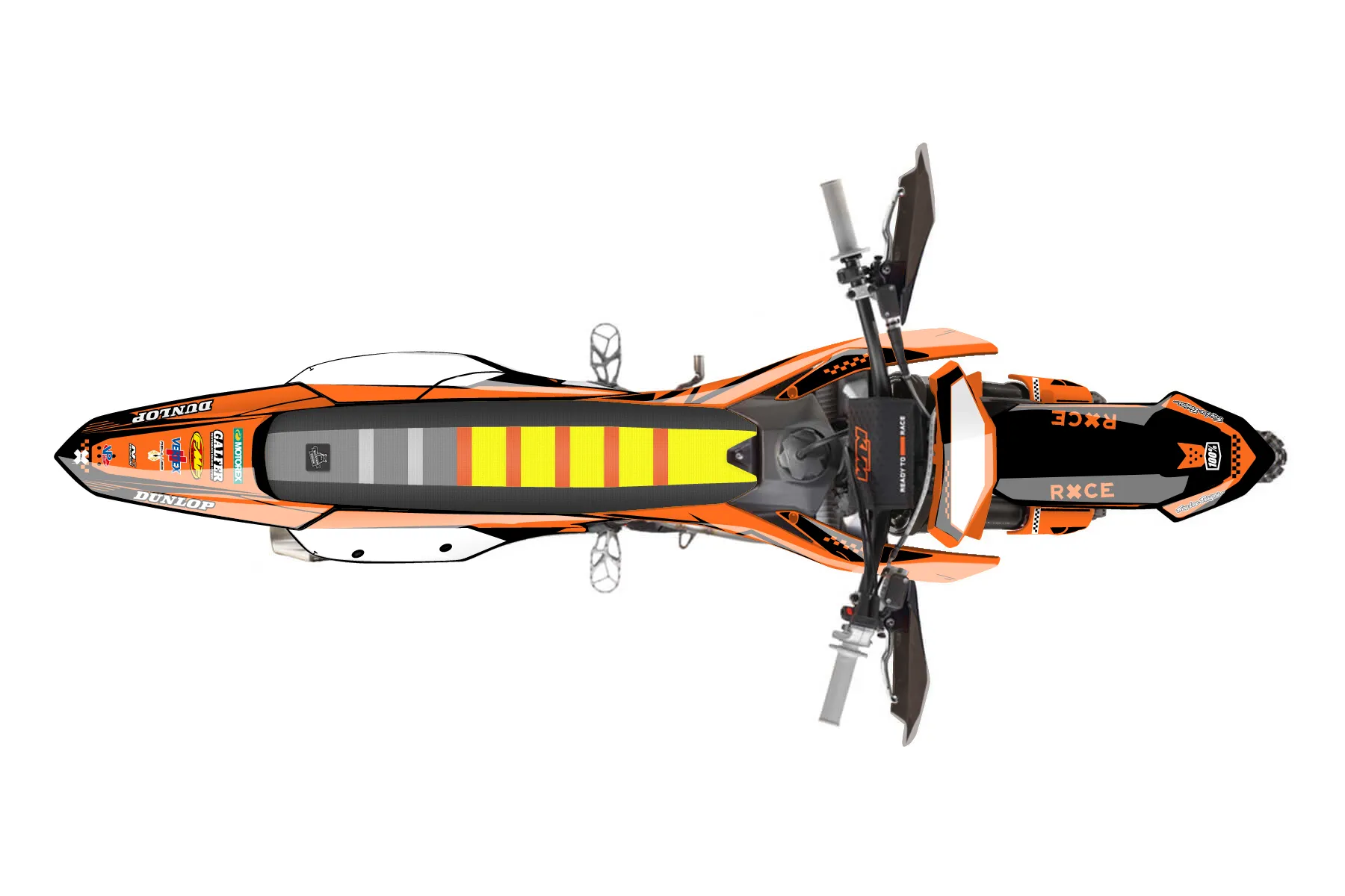 «britt 187» — готовый комплект графики серии Staple для KTM Offroad Graphic Kit KTM XC-F 350 2023. В комплекте: графика на бак и боковые облицовки, крылья (переднее и заднее), передний щиток, номерные таблички, защита вилки. Материал: ПВХ-винил 80 мкр с холодной ламинацией 300 мкр, общая толщина 380 мкр; покрытие глянцевое или матовое на выбор. Устойчив к UV-излучению, воде, бензину и мойке высокого давления. Клей акриловый на сольвентной основе — постоянный, для гибких пластиков. На простых поверхностях монтируется без нагрева; для сложных изгибов рекомендуем фен. Этот пресет можно заказать как есть или взять за основу в конструкторе: поменять цвета, добавить стартовый номер и свой бренд. Производство — 3–5 рабочих дней, доставка по России СДЭКом или Почтой, по СНГ — курьерскими службами.