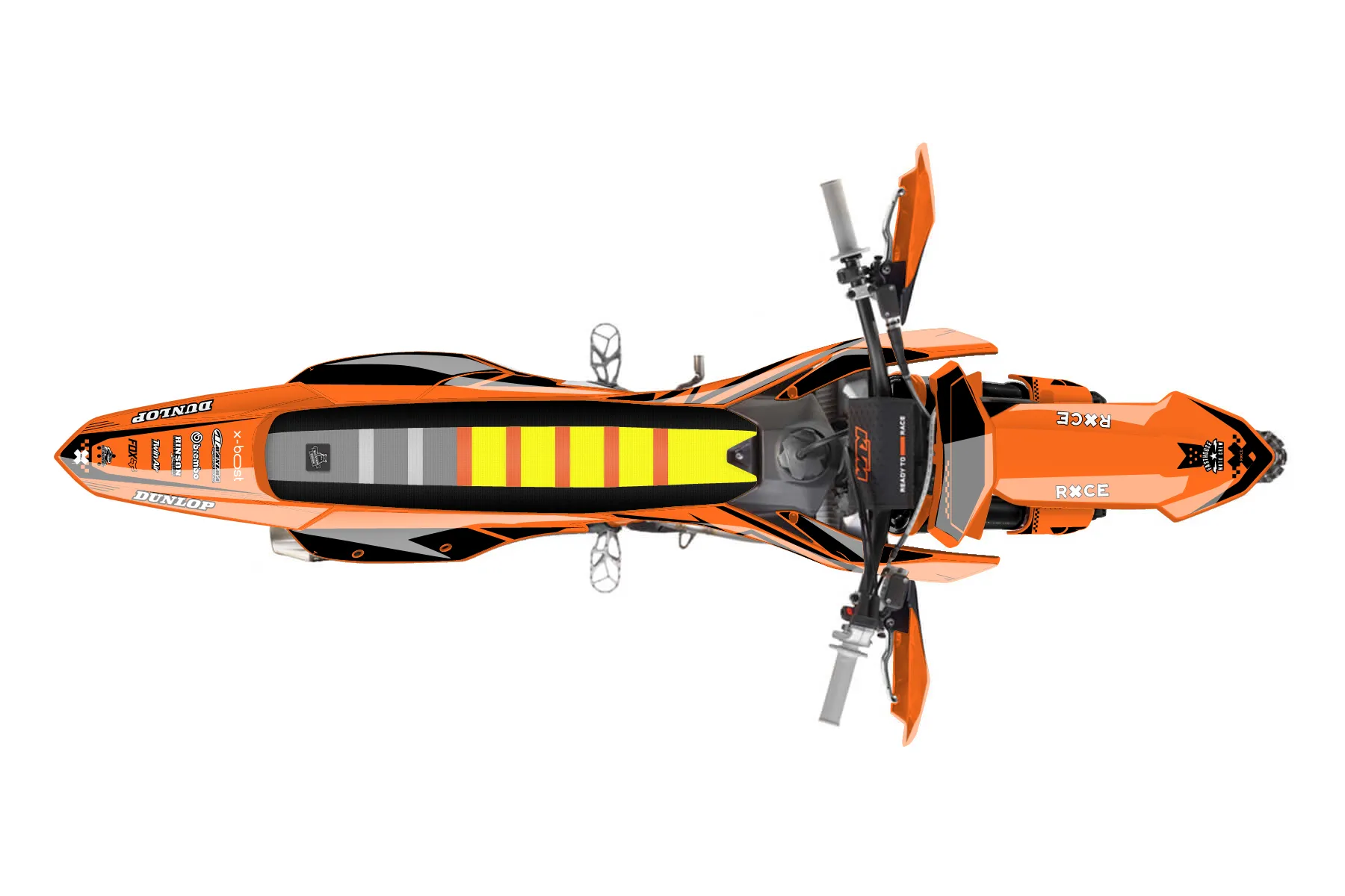 «KTM350!» — готовый комплект графики серии Staple для KTM Offroad Graphic Kit KTM XC-F 350 2023. В комплекте: графика на бак и боковые облицовки, крылья (переднее и заднее), передний щиток, номерные таблички, защита вилки. Материал: ПВХ-винил 80 мкр с холодной ламинацией 300 мкр, общая толщина 380 мкр; покрытие глянцевое или матовое на выбор. Устойчив к UV-излучению, воде, бензину и мойке высокого давления. Клей акриловый на сольвентной основе — постоянный, для гибких пластиков. На простых поверхностях монтируется без нагрева; для сложных изгибов рекомендуем фен. Этот пресет можно заказать как есть или взять за основу в конструкторе: поменять цвета, добавить стартовый номер и свой бренд. Производство — 3–5 рабочих дней, доставка по России СДЭКом или Почтой, по СНГ — курьерскими службами.
