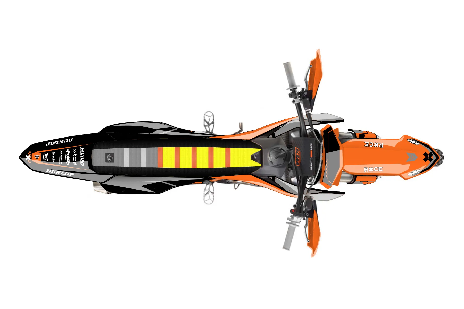 «Media» — готовый комплект графики серии Staple для KTM Offroad Graphic Kit KTM XC-F 350 2023. В комплекте: графика на бак и боковые облицовки, крылья (переднее и заднее), передний щиток, номерные таблички, защита вилки. Материал: ПВХ-винил 80 мкр с холодной ламинацией 300 мкр, общая толщина 380 мкр; покрытие глянцевое или матовое на выбор. Устойчив к UV-излучению, воде, бензину и мойке высокого давления. Клей акриловый на сольвентной основе — постоянный, для гибких пластиков. На простых поверхностях монтируется без нагрева; для сложных изгибов рекомендуем фен. Этот пресет можно заказать как есть или взять за основу в конструкторе: поменять цвета, добавить стартовый номер и свой бренд. Производство — 3–5 рабочих дней, доставка по России СДЭКом или Почтой, по СНГ — курьерскими службами.