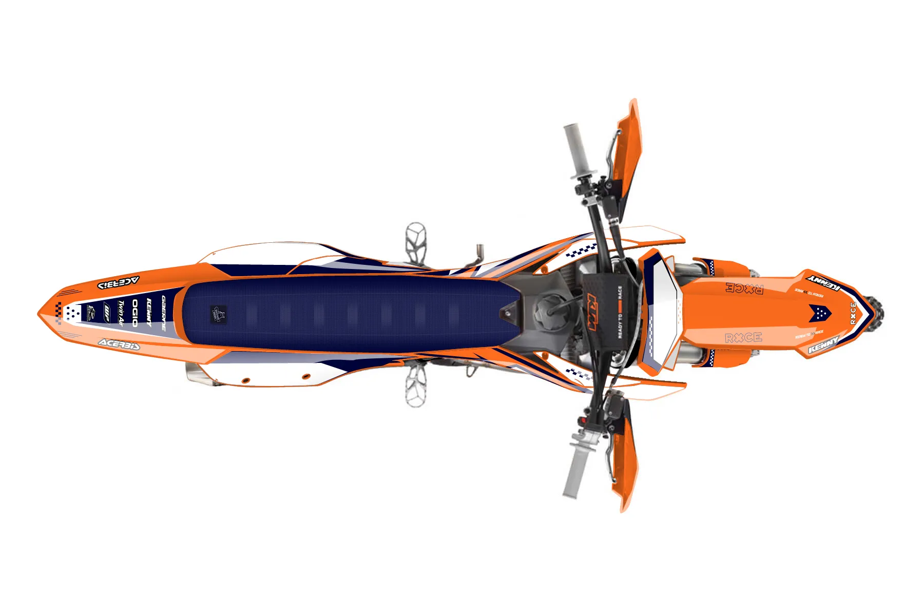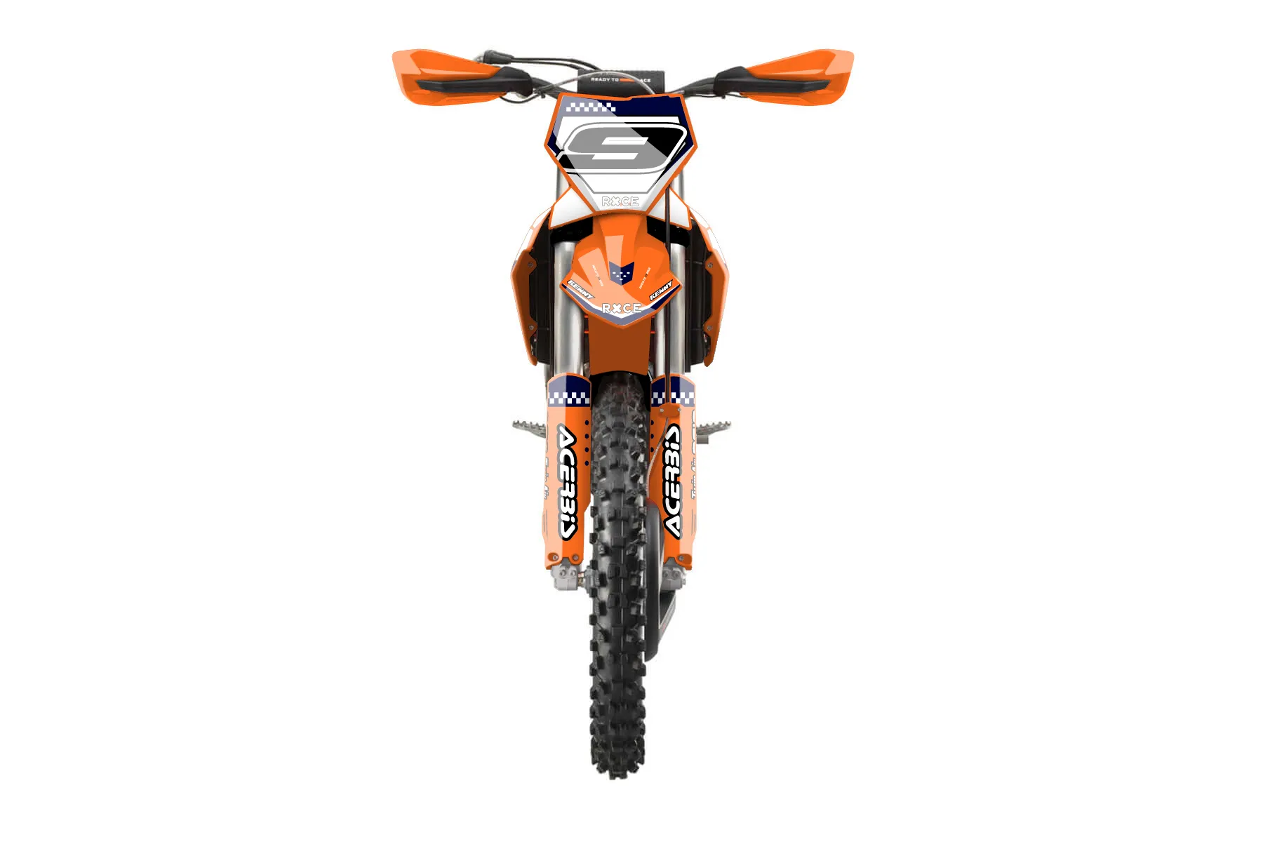 «OrangeDarkBlueWhite» — готовый комплект графики серии Staple для KTM Offroad Graphic Kit KTM XC-F 350 2023. В комплекте: графика на бак и боковые облицовки, крылья (переднее и заднее), передний щиток, номерные таблички, защита вилки. Материал: ПВХ-винил 80 мкр с холодной ламинацией 300 мкр, общая толщина 380 мкр; покрытие глянцевое или матовое на выбор. Устойчив к UV-излучению, воде, бензину и мойке высокого давления. Клей акриловый на сольвентной основе — постоянный, для гибких пластиков. На простых поверхностях монтируется без нагрева; для сложных изгибов рекомендуем фен. Этот пресет можно заказать как есть или взять за основу в конструкторе: поменять цвета, добавить стартовый номер и свой бренд. Производство — 3–5 рабочих дней, доставка по России СДЭКом или Почтой, по СНГ — курьерскими службами.