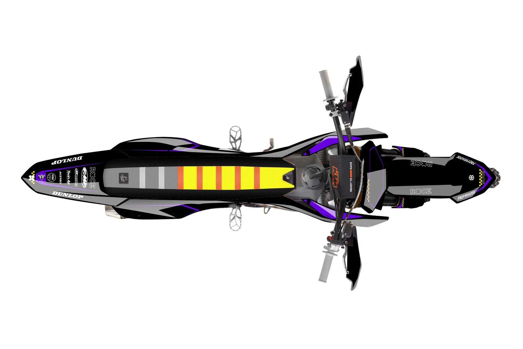 «Virtual» — готовый комплект графики серии Staple для KTM Offroad Graphic Kit KTM XC-F 350 2023. В комплекте: графика на бак и боковые облицовки, крылья (переднее и заднее), передний щиток, номерные таблички, защита вилки. Материал: ПВХ-винил 80 мкр с холодной ламинацией 300 мкр, общая толщина 380 мкр; покрытие глянцевое или матовое на выбор. Устойчив к UV-излучению, воде, бензину и мойке высокого давления. Клей акриловый на сольвентной основе — постоянный, для гибких пластиков. На простых поверхностях монтируется без нагрева; для сложных изгибов рекомендуем фен. Этот пресет можно заказать как есть или взять за основу в конструкторе: поменять цвета, добавить стартовый номер и свой бренд. Производство — 3–5 рабочих дней, доставка по России СДЭКом или Почтой, по СНГ — курьерскими службами.