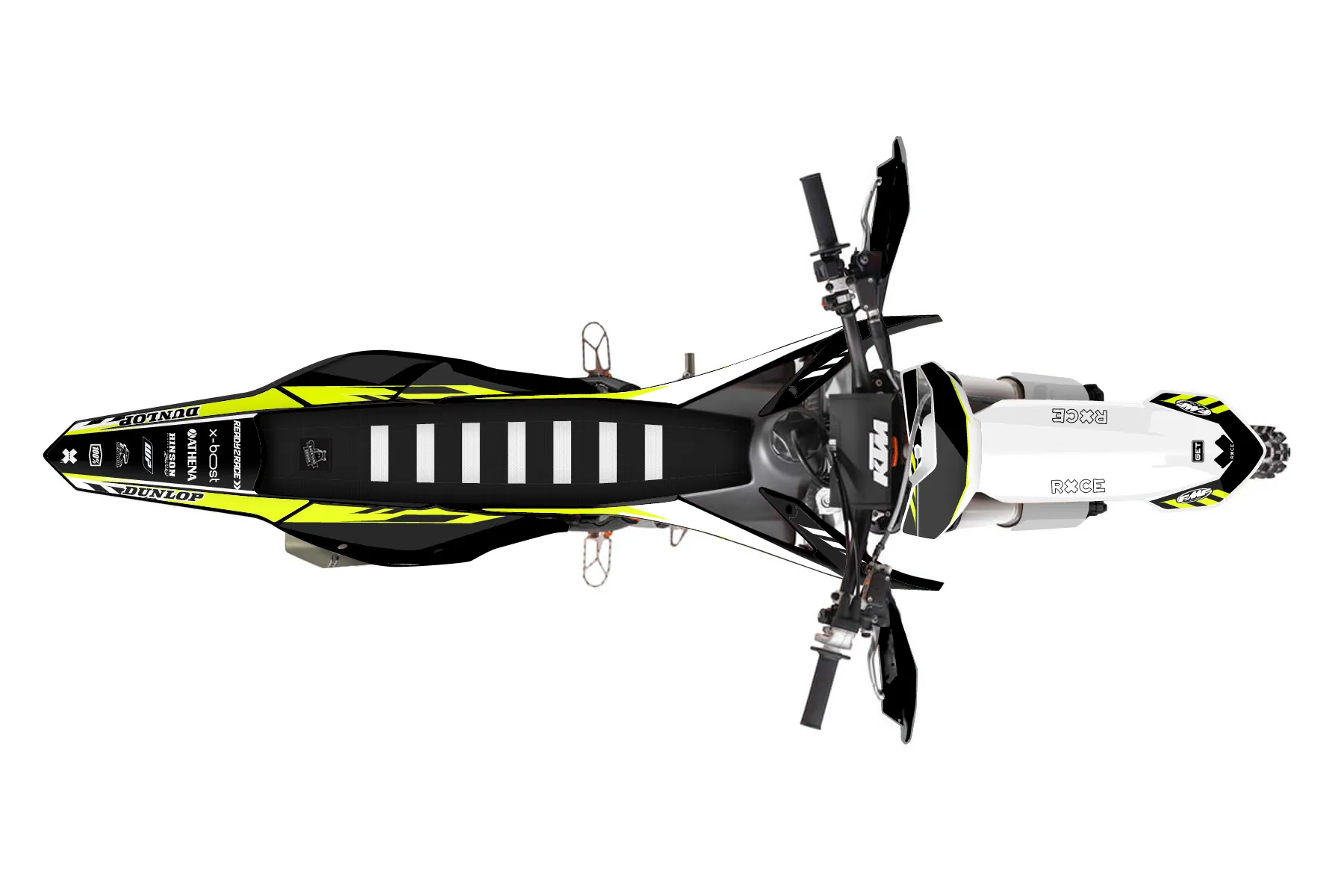 «Grip Neon» — готовый комплект графики серии Maverick для KTM Offroad Graphic Kit KTM XC-F 450 2016. В комплекте: графика на бак и боковые облицовки, крылья (переднее и заднее), передний щиток, номерные таблички, защита вилки. Материал: ПВХ-винил 80 мкр с холодной ламинацией 300 мкр, общая толщина 380 мкр; покрытие глянцевое или матовое на выбор. Устойчив к UV-излучению, воде, бензину и мойке высокого давления. Клей акриловый на сольвентной основе — постоянный, для гибких пластиков. На простых поверхностях монтируется без нагрева; для сложных изгибов рекомендуем фен. Этот пресет можно заказать как есть или взять за основу в конструкторе: поменять цвета, добавить стартовый номер и свой бренд. Производство — 3–5 рабочих дней, доставка по России СДЭКом или Почтой, по СНГ — курьерскими службами.