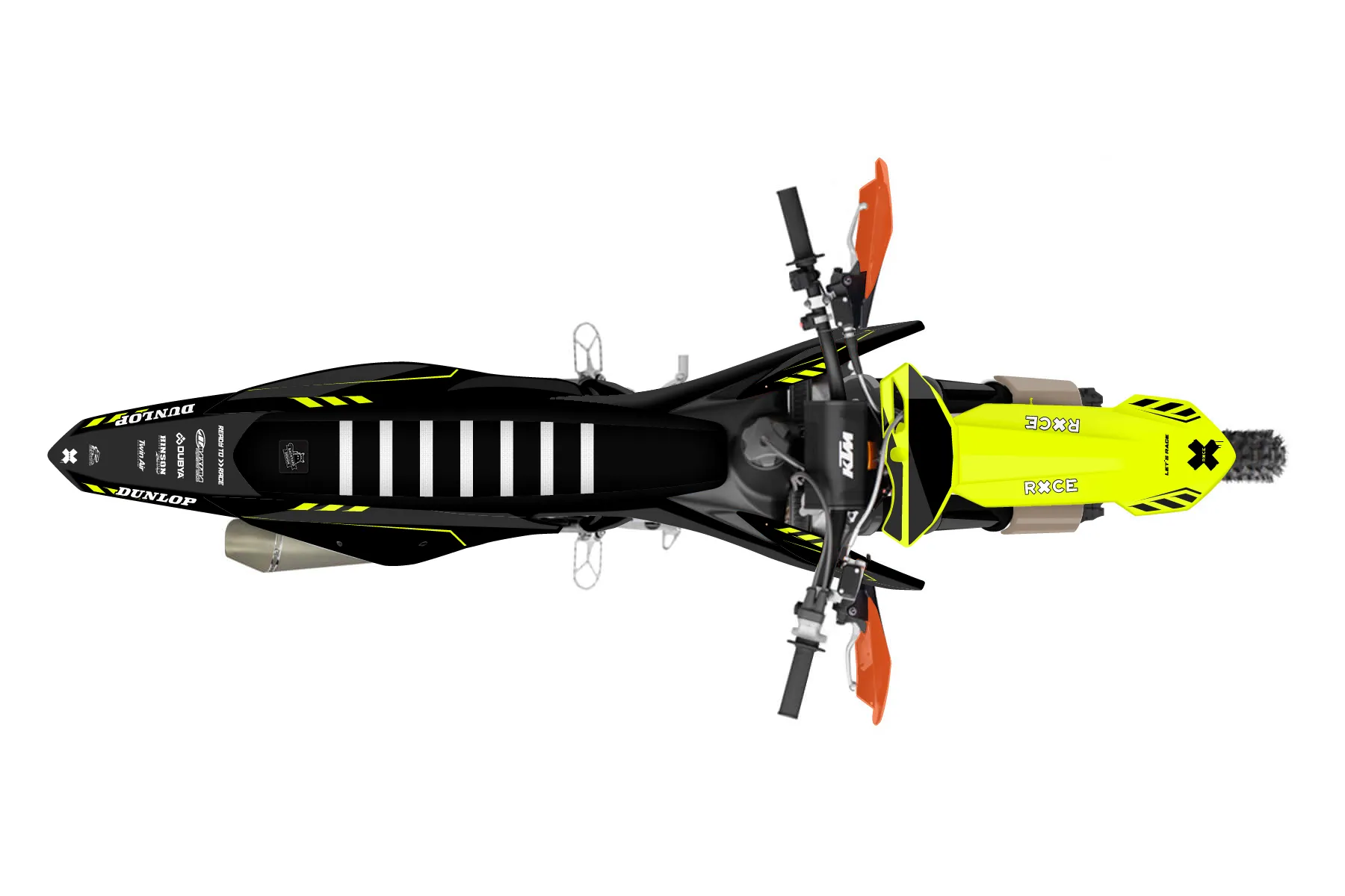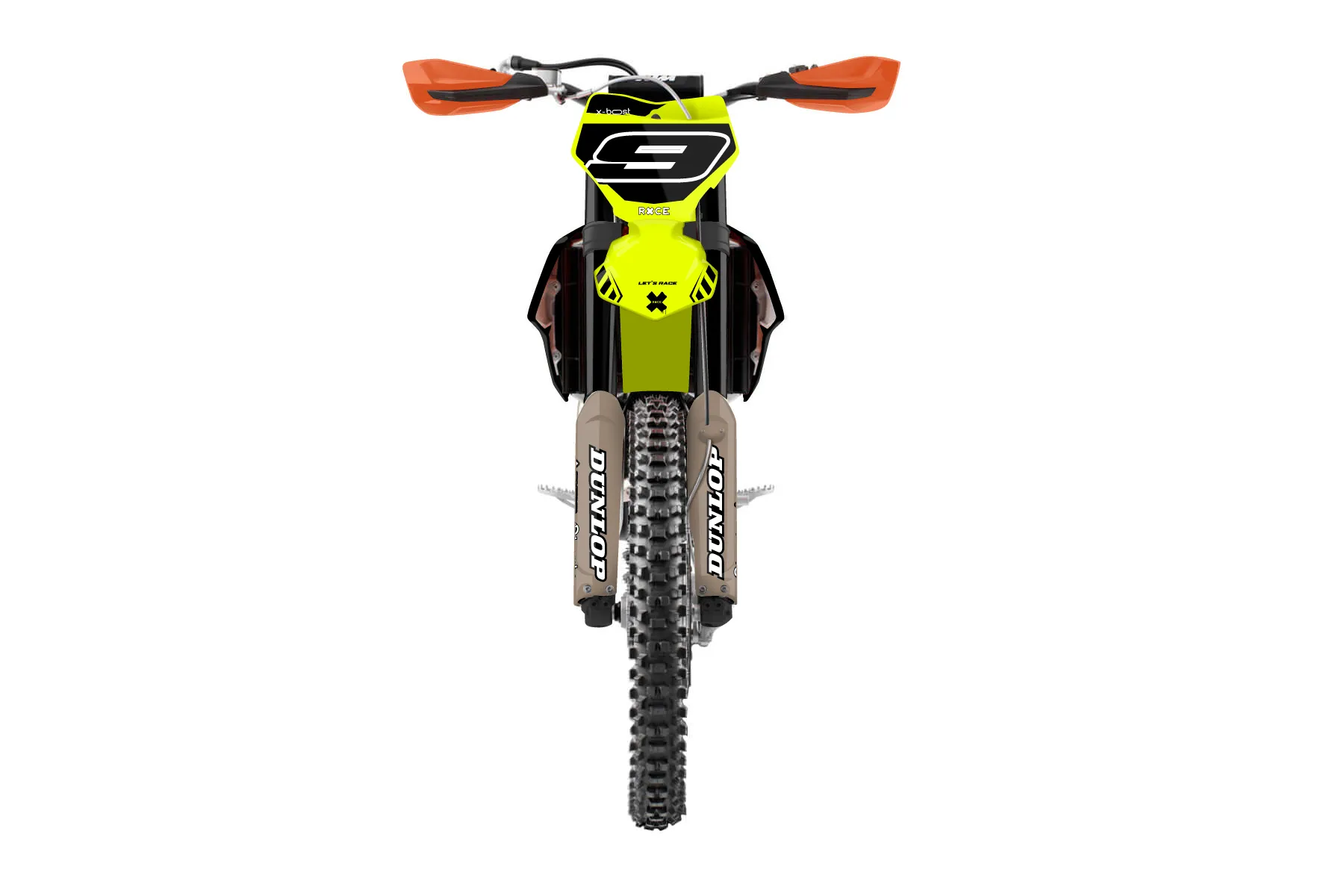 «Kitted Neon» — готовый комплект графики серии Maverick для KTM Offroad Graphic Kit KTM XC-F 450 2019. В комплекте: графика на бак и боковые облицовки, крылья (переднее и заднее), передний щиток, номерные таблички, защита вилки. Материал: ПВХ-винил 80 мкр с холодной ламинацией 300 мкр, общая толщина 380 мкр; покрытие глянцевое или матовое на выбор. Устойчив к UV-излучению, воде, бензину и мойке высокого давления. Клей акриловый на сольвентной основе — постоянный, для гибких пластиков. На простых поверхностях монтируется без нагрева; для сложных изгибов рекомендуем фен. Этот пресет можно заказать как есть или взять за основу в конструкторе: поменять цвета, добавить стартовый номер и свой бренд. Производство — 3–5 рабочих дней, доставка по России СДЭКом или Почтой, по СНГ — курьерскими службами.