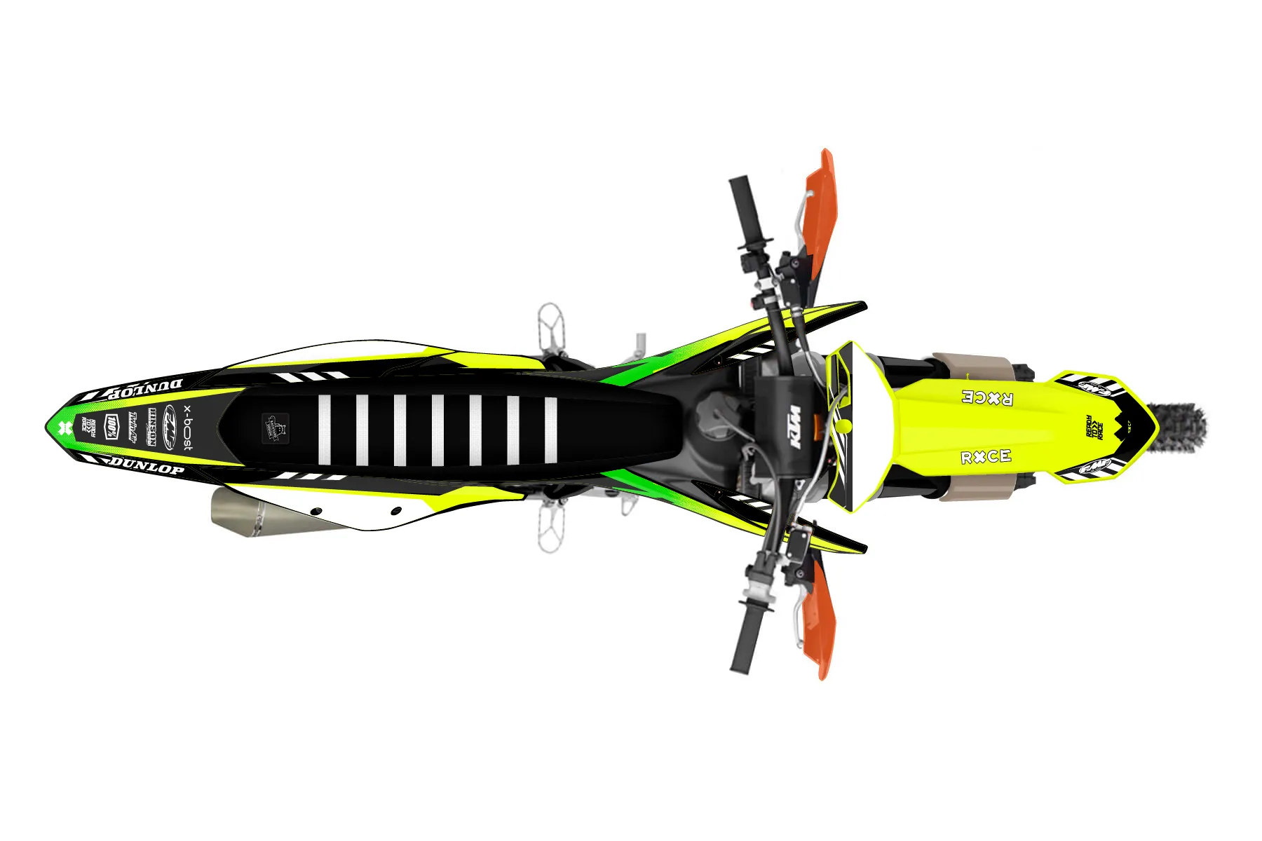 «Volt Neon» — готовый комплект графики серии Maverick для KTM Offroad Graphic Kit KTM XC-F 450 2019. В комплекте: графика на бак и боковые облицовки, крылья (переднее и заднее), передний щиток, номерные таблички, защита вилки. Материал: ПВХ-винил 80 мкр с холодной ламинацией 300 мкр, общая толщина 380 мкр; покрытие глянцевое или матовое на выбор. Устойчив к UV-излучению, воде, бензину и мойке высокого давления. Клей акриловый на сольвентной основе — постоянный, для гибких пластиков. На простых поверхностях монтируется без нагрева; для сложных изгибов рекомендуем фен. Этот пресет можно заказать как есть или взять за основу в конструкторе: поменять цвета, добавить стартовый номер и свой бренд. Производство — 3–5 рабочих дней, доставка по России СДЭКом или Почтой, по СНГ — курьерскими службами.