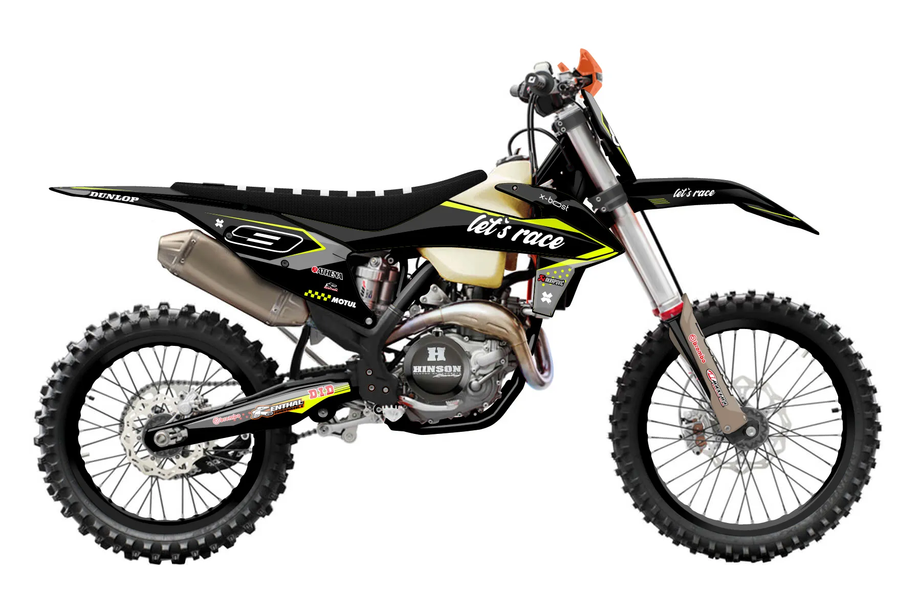 «Refuse Neon» — готовый комплект графики серии Staple для KTM Offroad Graphic Kit KTM XC-F 450 2019. В комплекте: графика на бак и боковые облицовки, крылья (переднее и заднее), передний щиток, номерные таблички, защита вилки. Материал: ПВХ-винил 80 мкр с холодной ламинацией 300 мкр, общая толщина 380 мкр; покрытие глянцевое или матовое на выбор. Устойчив к UV-излучению, воде, бензину и мойке высокого давления. Клей акриловый на сольвентной основе — постоянный, для гибких пластиков. На простых поверхностях монтируется без нагрева; для сложных изгибов рекомендуем фен. Этот пресет можно заказать как есть или взять за основу в конструкторе: поменять цвета, добавить стартовый номер и свой бренд. Производство — 3–5 рабочих дней, доставка по России СДЭКом или Почтой, по СНГ — курьерскими службами.