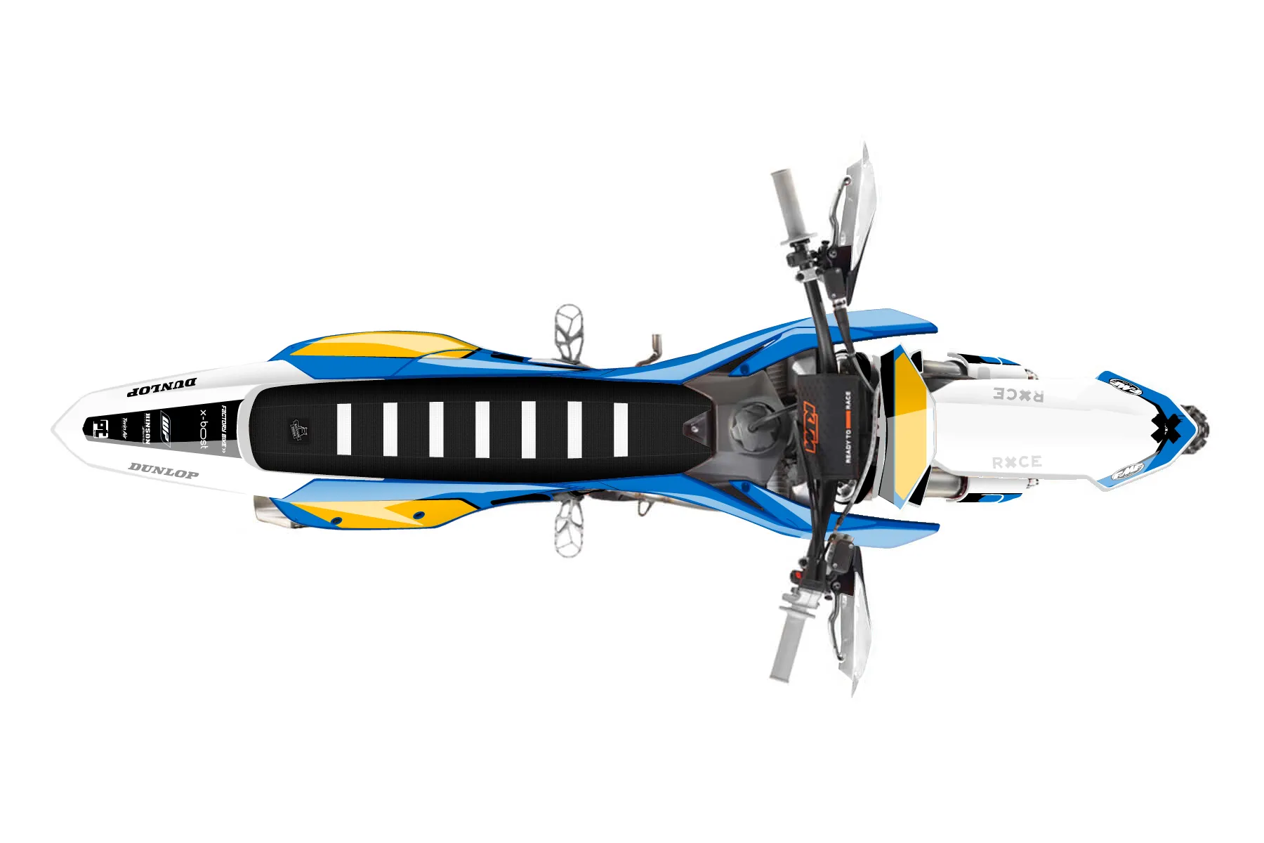 «All-Star» — готовый комплект графики серии Flow для KTM Offroad Graphic Kit KTM XC-F 450 2023. В комплекте: графика на бак и боковые облицовки, крылья (переднее и заднее), передний щиток, номерные таблички, защита вилки. Материал: ПВХ-винил 80 мкр с холодной ламинацией 300 мкр, общая толщина 380 мкр; покрытие глянцевое или матовое на выбор. Устойчив к UV-излучению, воде, бензину и мойке высокого давления. Клей акриловый на сольвентной основе — постоянный, для гибких пластиков. На простых поверхностях монтируется без нагрева; для сложных изгибов рекомендуем фен. Этот пресет можно заказать как есть или взять за основу в конструкторе: поменять цвета, добавить стартовый номер и свой бренд. Производство — 3–5 рабочих дней, доставка по России СДЭКом или Почтой, по СНГ — курьерскими службами.