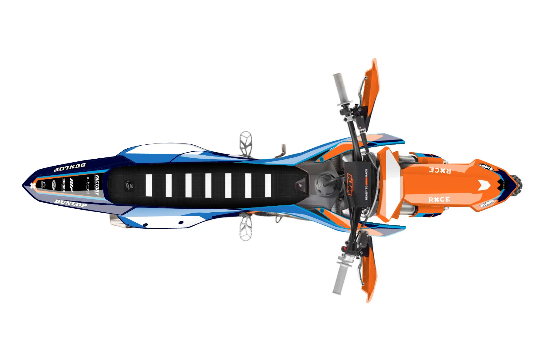 «Meta» — готовый комплект графики серии Flow для KTM Offroad Graphic Kit KTM XC-F 450 2023. В комплекте: графика на бак и боковые облицовки, крылья (переднее и заднее), передний щиток, номерные таблички, защита вилки. Материал: ПВХ-винил 80 мкр с холодной ламинацией 300 мкр, общая толщина 380 мкр; покрытие глянцевое или матовое на выбор. Устойчив к UV-излучению, воде, бензину и мойке высокого давления. Клей акриловый на сольвентной основе — постоянный, для гибких пластиков. На простых поверхностях монтируется без нагрева; для сложных изгибов рекомендуем фен. Этот пресет можно заказать как есть или взять за основу в конструкторе: поменять цвета, добавить стартовый номер и свой бренд. Производство — 3–5 рабочих дней, доставка по России СДЭКом или Почтой, по СНГ — курьерскими службами.