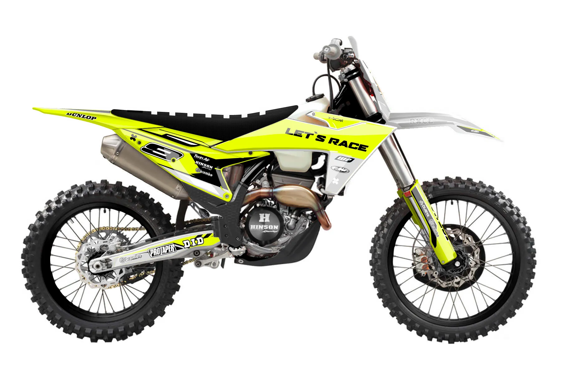 «Ryder Neon» — готовый комплект графики серии Maverick для KTM Offroad Graphic Kit KTM XC-F 450 2023. В комплекте: графика на бак и боковые облицовки, крылья (переднее и заднее), передний щиток, номерные таблички, защита вилки. Материал: ПВХ-винил 80 мкр с холодной ламинацией 300 мкр, общая толщина 380 мкр; покрытие глянцевое или матовое на выбор. Устойчив к UV-излучению, воде, бензину и мойке высокого давления. Клей акриловый на сольвентной основе — постоянный, для гибких пластиков. На простых поверхностях монтируется без нагрева; для сложных изгибов рекомендуем фен. Этот пресет можно заказать как есть или взять за основу в конструкторе: поменять цвета, добавить стартовый номер и свой бренд. Производство — 3–5 рабочих дней, доставка по России СДЭКом или Почтой, по СНГ — курьерскими службами.