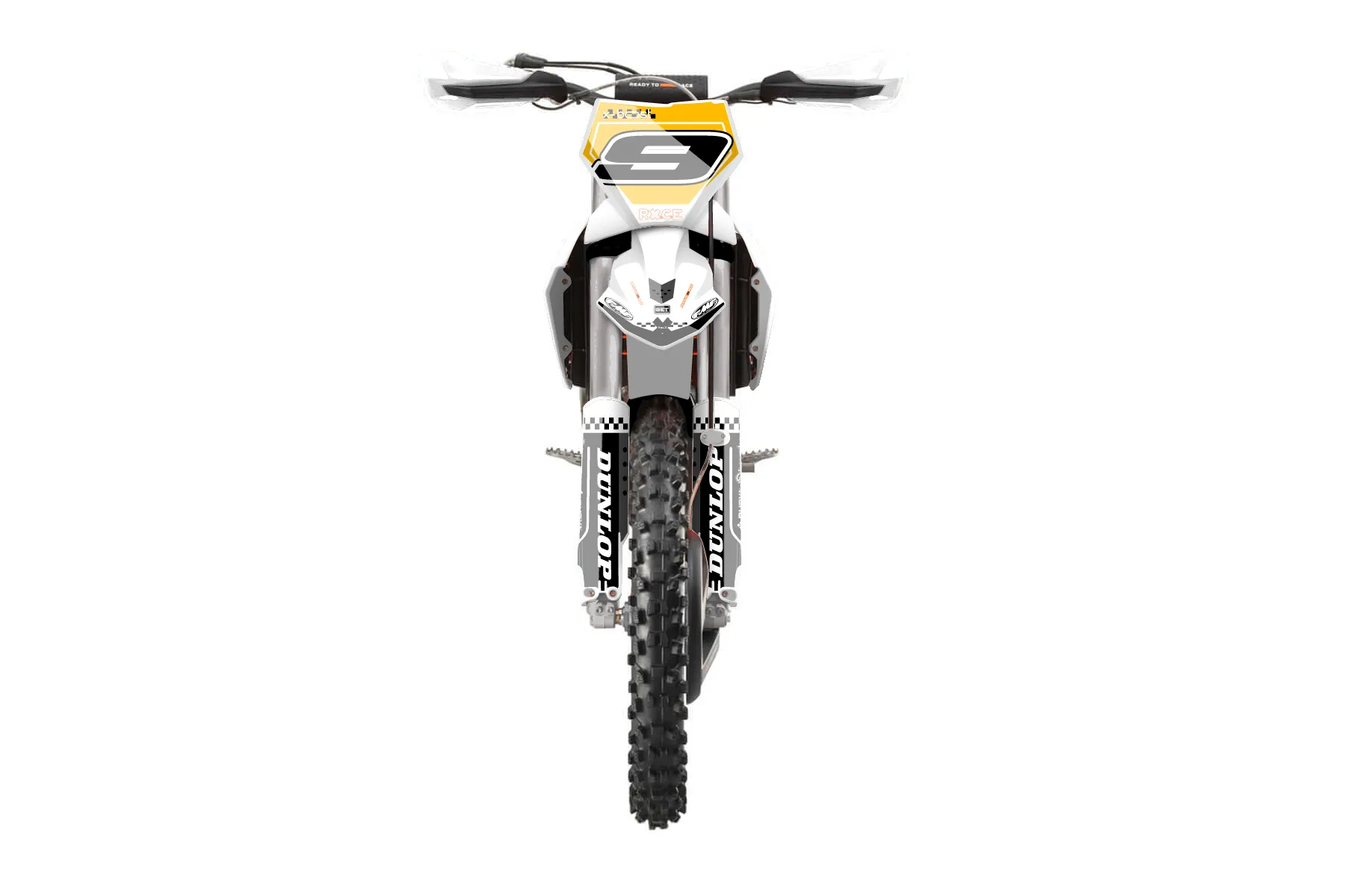 «450xcf v1 no logos» — готовый комплект графики серии Staple для KTM Offroad Graphic Kit KTM XC-F 450 2023. В комплекте: графика на бак и боковые облицовки, крылья (переднее и заднее), передний щиток, номерные таблички, защита вилки. Материал: ПВХ-винил 80 мкр с холодной ламинацией 300 мкр, общая толщина 380 мкр; покрытие глянцевое или матовое на выбор. Устойчив к UV-излучению, воде, бензину и мойке высокого давления. Клей акриловый на сольвентной основе — постоянный, для гибких пластиков. На простых поверхностях монтируется без нагрева; для сложных изгибов рекомендуем фен. Этот пресет можно заказать как есть или взять за основу в конструкторе: поменять цвета, добавить стартовый номер и свой бренд. Производство — 3–5 рабочих дней, доставка по России СДЭКом или Почтой, по СНГ — курьерскими службами.