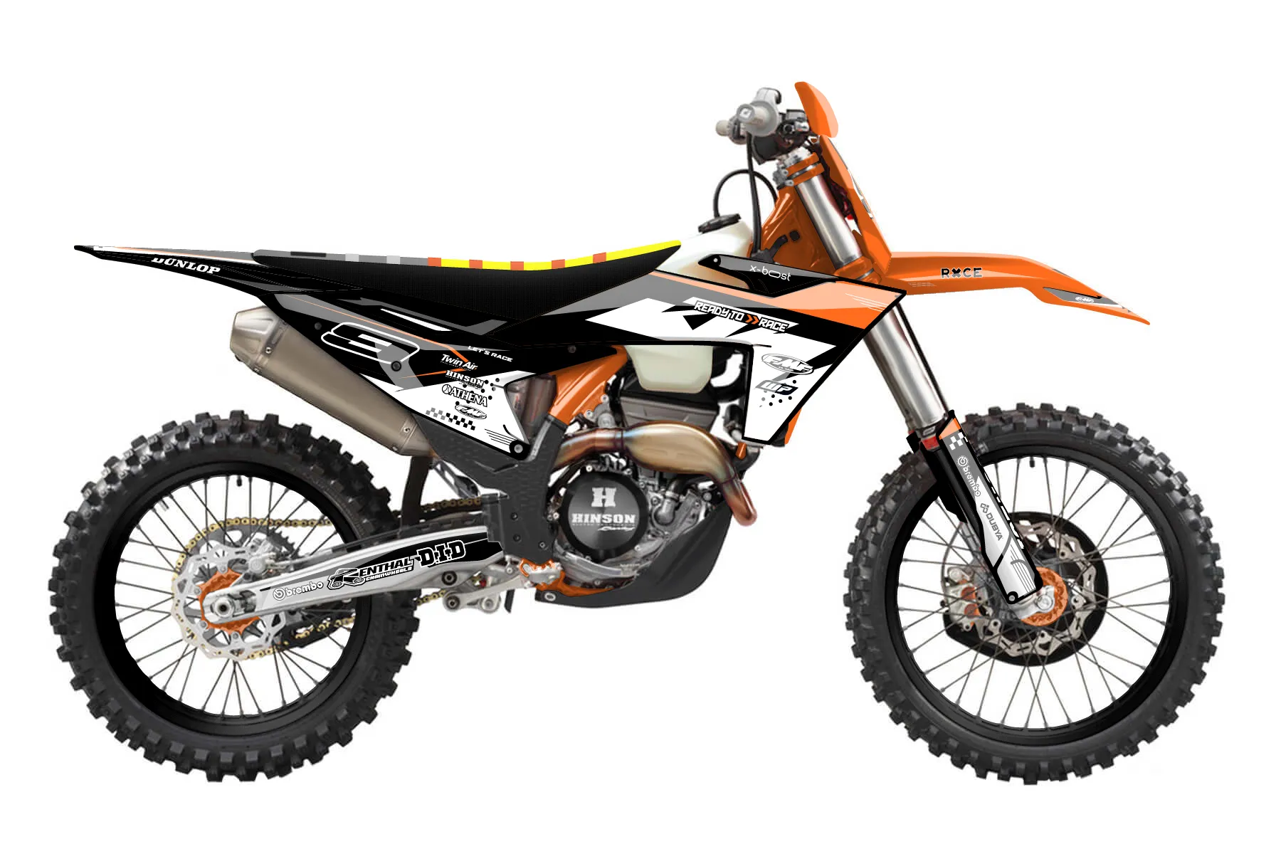«4Time» — готовый комплект графики серии Staple для KTM Offroad Graphic Kit KTM XC-F 450 2023. В комплекте: графика на бак и боковые облицовки, крылья (переднее и заднее), передний щиток, номерные таблички, защита вилки. Материал: ПВХ-винил 80 мкр с холодной ламинацией 300 мкр, общая толщина 380 мкр; покрытие глянцевое или матовое на выбор. Устойчив к UV-излучению, воде, бензину и мойке высокого давления. Клей акриловый на сольвентной основе — постоянный, для гибких пластиков. На простых поверхностях монтируется без нагрева; для сложных изгибов рекомендуем фен. Этот пресет можно заказать как есть или взять за основу в конструкторе: поменять цвета, добавить стартовый номер и свой бренд. Производство — 3–5 рабочих дней, доставка по России СДЭКом или Почтой, по СНГ — курьерскими службами.