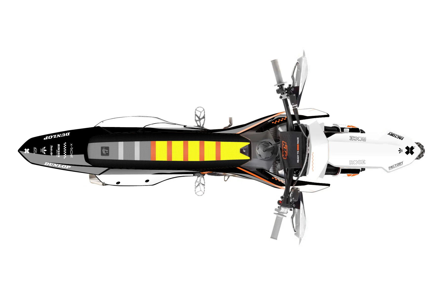«Covering» — готовый комплект графики серии Staple для KTM Offroad Graphic Kit KTM XC-F 450 2023. В комплекте: графика на бак и боковые облицовки, крылья (переднее и заднее), передний щиток, номерные таблички, защита вилки. Материал: ПВХ-винил 80 мкр с холодной ламинацией 300 мкр, общая толщина 380 мкр; покрытие глянцевое или матовое на выбор. Устойчив к UV-излучению, воде, бензину и мойке высокого давления. Клей акриловый на сольвентной основе — постоянный, для гибких пластиков. На простых поверхностях монтируется без нагрева; для сложных изгибов рекомендуем фен. Этот пресет можно заказать как есть или взять за основу в конструкторе: поменять цвета, добавить стартовый номер и свой бренд. Производство — 3–5 рабочих дней, доставка по России СДЭКом или Почтой, по СНГ — курьерскими службами.