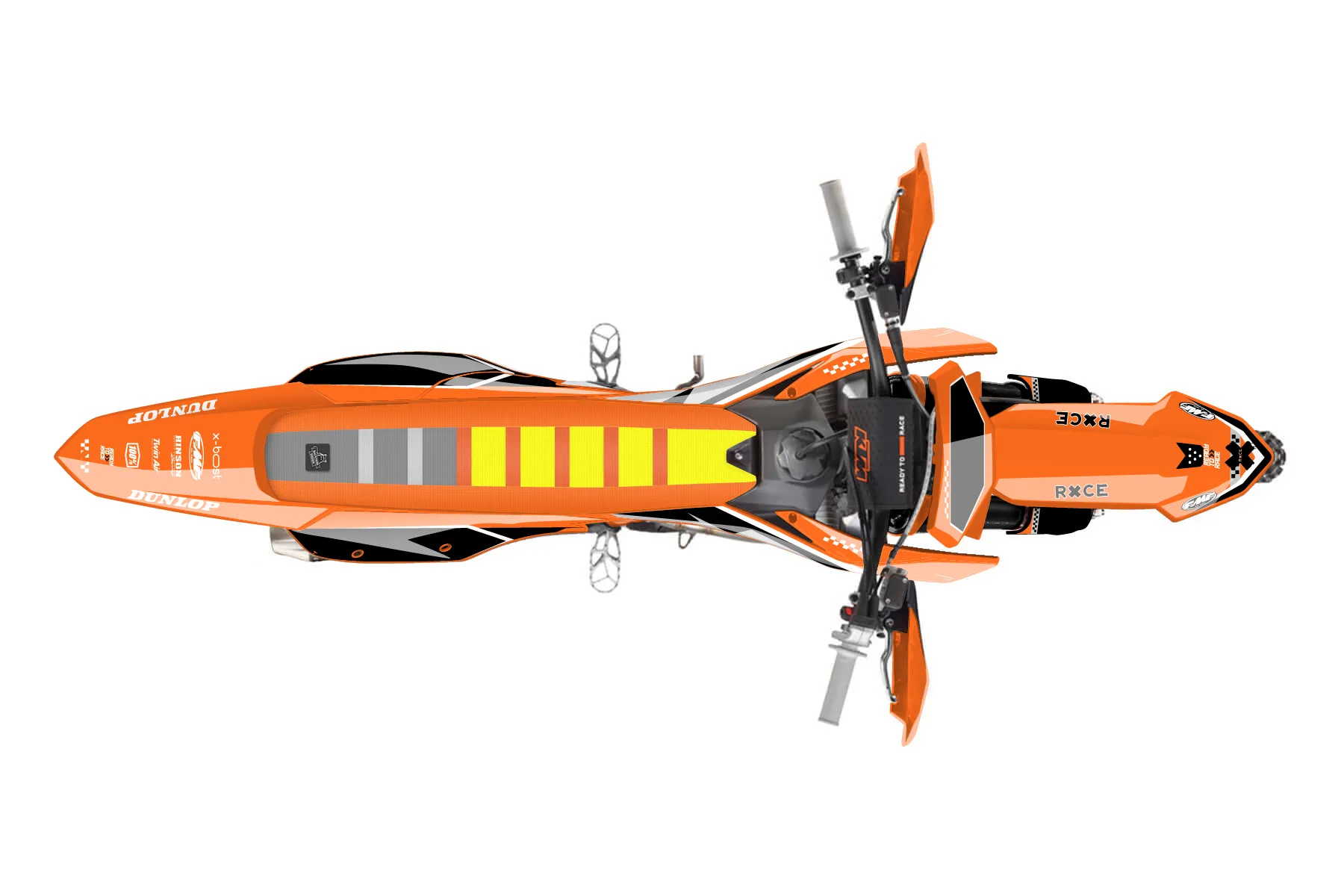 «Data» — готовый комплект графики серии Staple для KTM Offroad Graphic Kit KTM XC-F 450 2023. В комплекте: графика на бак и боковые облицовки, крылья (переднее и заднее), передний щиток, номерные таблички, защита вилки. Материал: ПВХ-винил 80 мкр с холодной ламинацией 300 мкр, общая толщина 380 мкр; покрытие глянцевое или матовое на выбор. Устойчив к UV-излучению, воде, бензину и мойке высокого давления. Клей акриловый на сольвентной основе — постоянный, для гибких пластиков. На простых поверхностях монтируется без нагрева; для сложных изгибов рекомендуем фен. Этот пресет можно заказать как есть или взять за основу в конструкторе: поменять цвета, добавить стартовый номер и свой бренд. Производство — 3–5 рабочих дней, доставка по России СДЭКом или Почтой, по СНГ — курьерскими службами.