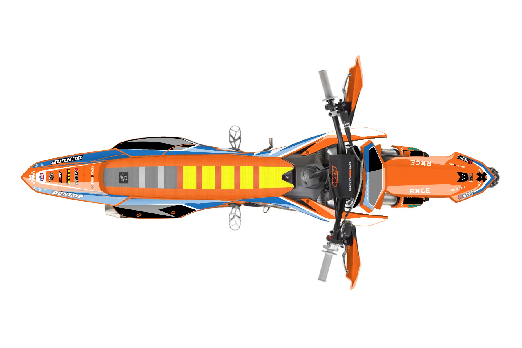 «Stamp» — готовый комплект графики серии Staple для KTM Offroad Graphic Kit KTM XC-F 450 2023. В комплекте: графика на бак и боковые облицовки, крылья (переднее и заднее), передний щиток, номерные таблички, защита вилки. Материал: ПВХ-винил 80 мкр с холодной ламинацией 300 мкр, общая толщина 380 мкр; покрытие глянцевое или матовое на выбор. Устойчив к UV-излучению, воде, бензину и мойке высокого давления. Клей акриловый на сольвентной основе — постоянный, для гибких пластиков. На простых поверхностях монтируется без нагрева; для сложных изгибов рекомендуем фен. Этот пресет можно заказать как есть или взять за основу в конструкторе: поменять цвета, добавить стартовый номер и свой бренд. Производство — 3–5 рабочих дней, доставка по России СДЭКом или Почтой, по СНГ — курьерскими службами.