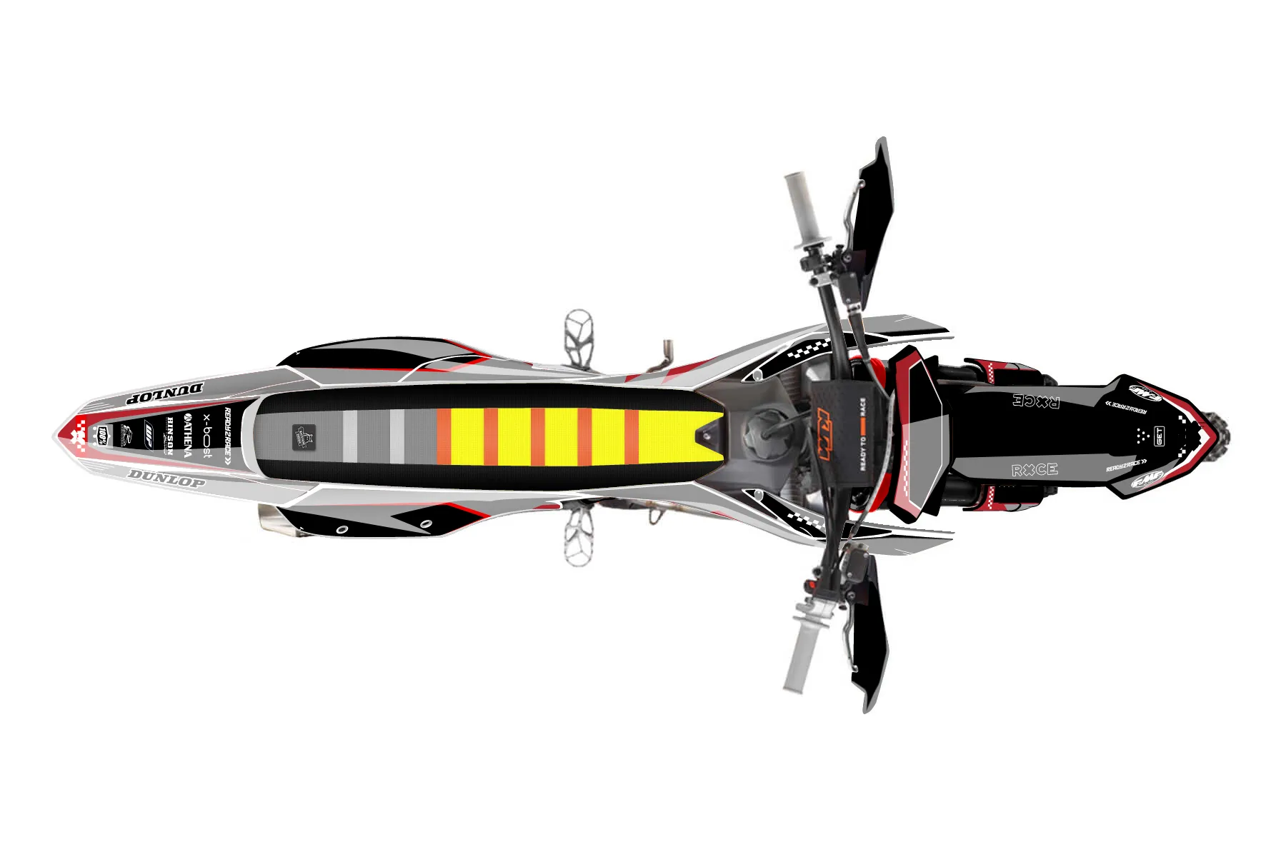 «Tack» — готовый комплект графики серии Staple для KTM Offroad Graphic Kit KTM XC-F 450 2023. В комплекте: графика на бак и боковые облицовки, крылья (переднее и заднее), передний щиток, номерные таблички, защита вилки. Материал: ПВХ-винил 80 мкр с холодной ламинацией 300 мкр, общая толщина 380 мкр; покрытие глянцевое или матовое на выбор. Устойчив к UV-излучению, воде, бензину и мойке высокого давления. Клей акриловый на сольвентной основе — постоянный, для гибких пластиков. На простых поверхностях монтируется без нагрева; для сложных изгибов рекомендуем фен. Этот пресет можно заказать как есть или взять за основу в конструкторе: поменять цвета, добавить стартовый номер и свой бренд. Производство — 3–5 рабочих дней, доставка по России СДЭКом или Почтой, по СНГ — курьерскими службами.