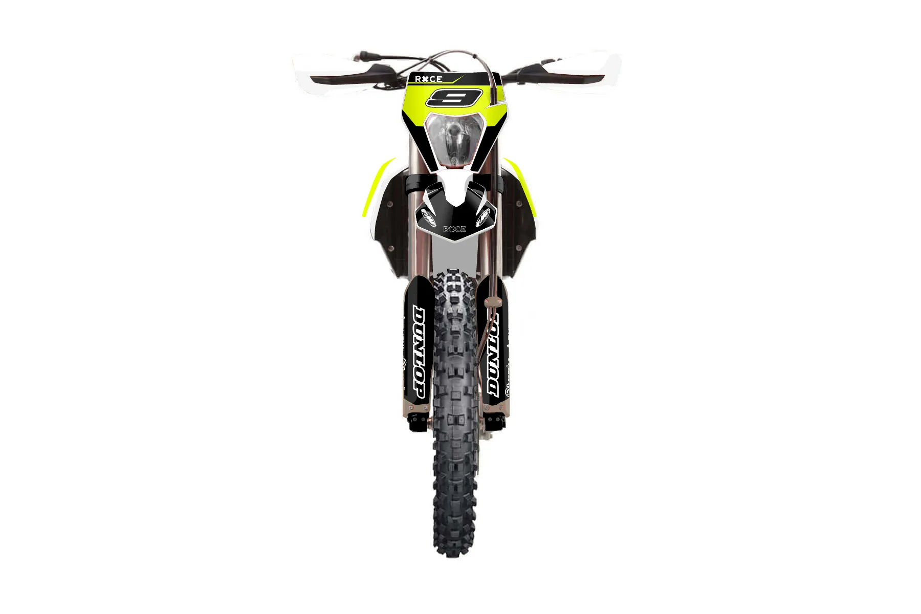 «Ryder Neon» — готовый комплект графики серии Maverick для KTM Enduro Graphic Kit KTM XCF-W 450 2022. В комплекте: графика на бак и боковые облицовки, крылья (переднее и заднее), передний щиток, номерные таблички, защита вилки. Материал: ПВХ-винил 80 мкр с холодной ламинацией 300 мкр, общая толщина 380 мкр; покрытие глянцевое или матовое на выбор. Устойчив к UV-излучению, воде, бензину и мойке высокого давления. Клей акриловый на сольвентной основе — постоянный, для гибких пластиков. На простых поверхностях монтируется без нагрева; для сложных изгибов рекомендуем фен. Этот пресет можно заказать как есть или взять за основу в конструкторе: поменять цвета, добавить стартовый номер и свой бренд. Производство — 3–5 рабочих дней, доставка по России СДЭКом или Почтой, по СНГ — курьерскими службами.