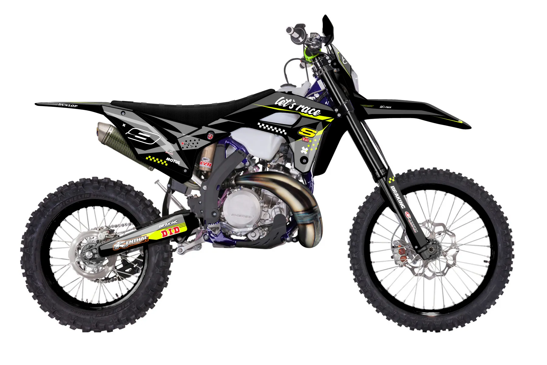 «Bright Neon» — готовый комплект графики серии Staple для Sherco Enduro Graphic Kit Sherco SE 125 2017. В комплекте: графика на бак и боковые облицовки, крылья (переднее и заднее), передний щиток, номерные таблички, защита вилки. Материал: ПВХ-винил 80 мкр с холодной ламинацией 300 мкр, общая толщина 380 мкр; покрытие глянцевое или матовое на выбор. Устойчив к UV-излучению, воде, бензину и мойке высокого давления. Клей акриловый на сольвентной основе — постоянный, для гибких пластиков. На простых поверхностях монтируется без нагрева; для сложных изгибов рекомендуем фен. Этот пресет можно заказать как есть или взять за основу в конструкторе: поменять цвета, добавить стартовый номер и свой бренд. Производство — 3–5 рабочих дней, доставка по России СДЭКом или Почтой, по СНГ — курьерскими службами.