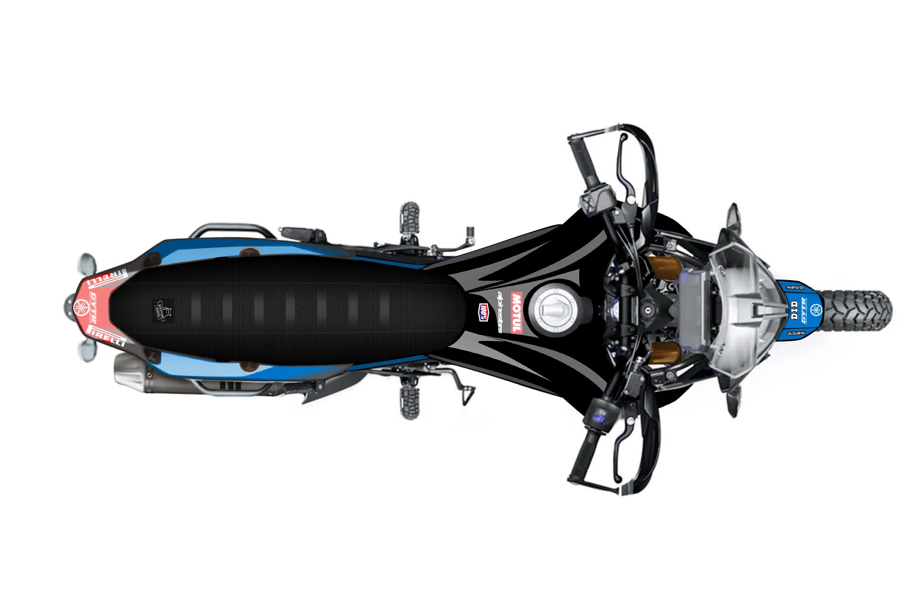 «Tenere Blue» — готовый комплект графики серии Untucked для Yamaha Enduro Graphic Kit Yamaha Ténéré 700 2020. В комплекте: графика на бак и боковые облицовки, крылья (переднее и заднее), передний щиток, номерные таблички, защита вилки. Материал: ПВХ-винил 80 мкр с холодной ламинацией 300 мкр, общая толщина 380 мкр; покрытие глянцевое или матовое на выбор. Устойчив к UV-излучению, воде, бензину и мойке высокого давления. Клей акриловый на сольвентной основе — постоянный, для гибких пластиков. На простых поверхностях монтируется без нагрева; для сложных изгибов рекомендуем фен. Этот пресет можно заказать как есть или взять за основу в конструкторе: поменять цвета, добавить стартовый номер и свой бренд. Производство — 3–5 рабочих дней, доставка по России СДЭКом или Почтой, по СНГ — курьерскими службами.