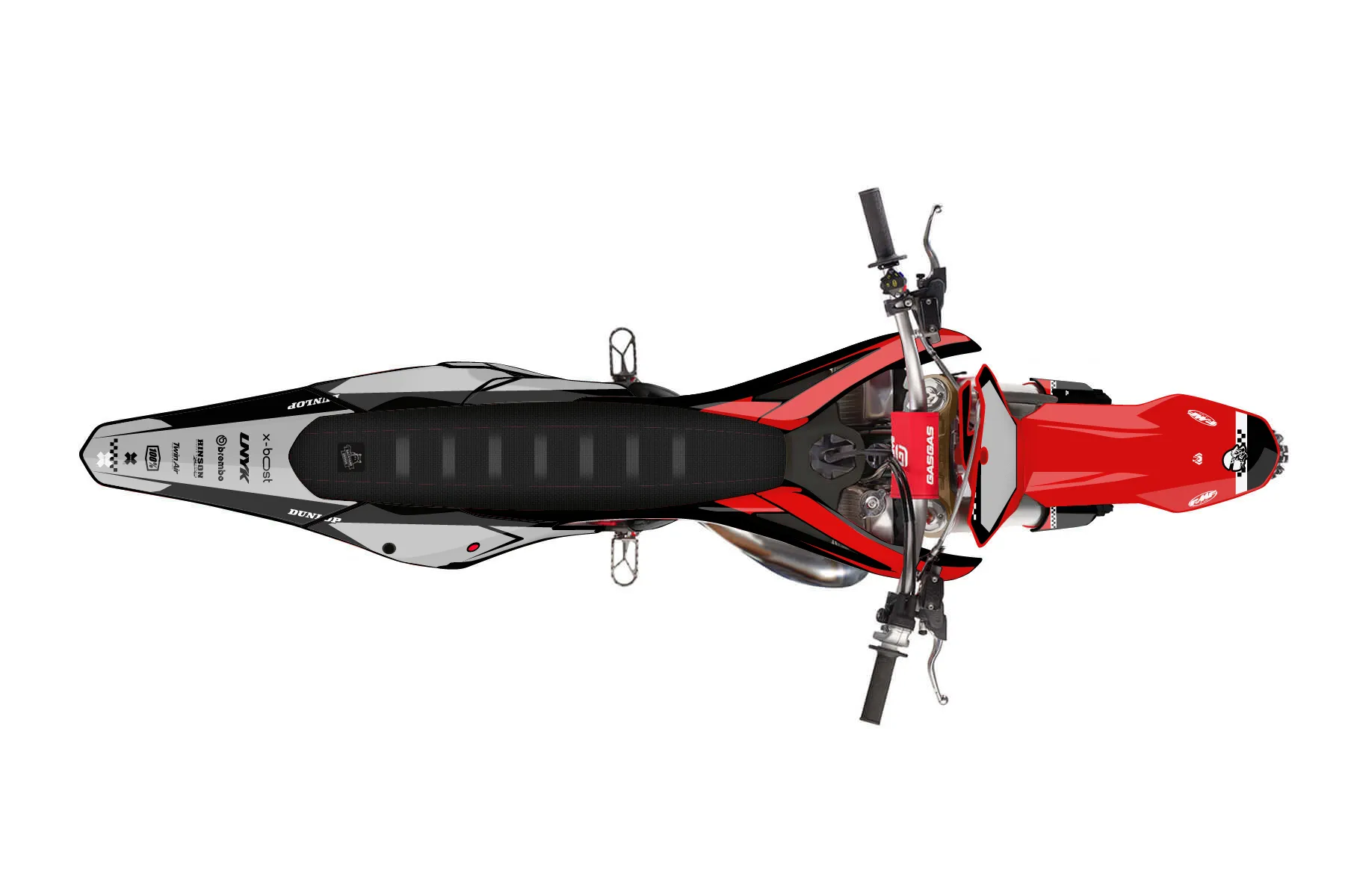 «CustomDesign» — готовый комплект графики серии Staple для GasGas MX Graphic Kit GasGas MC 250 2021. В комплекте: графика на бак и боковые облицовки, крылья (переднее и заднее), передний щиток, номерные таблички, защита вилки. Материал: ПВХ-винил 80 мкр с холодной ламинацией 300 мкр, общая толщина 380 мкр; покрытие глянцевое или матовое на выбор. Устойчив к UV-излучению, воде, бензину и мойке высокого давления. Клей акриловый на сольвентной основе — постоянный, для гибких пластиков. На простых поверхностях монтируется без нагрева; для сложных изгибов рекомендуем фен. Этот пресет можно заказать как есть или взять за основу в конструкторе: поменять цвета, добавить стартовый номер и свой бренд. Производство — 3–5 рабочих дней, доставка по России СДЭКом или Почтой, по СНГ — курьерскими службами.