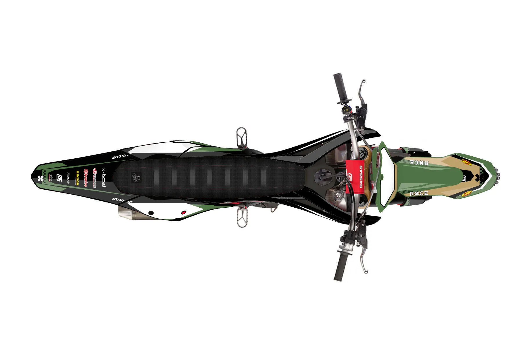 «Signature» — готовый комплект графики серии Staple для GasGas MX Graphic Kit GasGas MC 350F 2021. В комплекте: графика на бак и боковые облицовки, крылья (переднее и заднее), передний щиток, номерные таблички, защита вилки. Материал: ПВХ-винил 80 мкр с холодной ламинацией 300 мкр, общая толщина 380 мкр; покрытие глянцевое или матовое на выбор. Устойчив к UV-излучению, воде, бензину и мойке высокого давления. Клей акриловый на сольвентной основе — постоянный, для гибких пластиков. На простых поверхностях монтируется без нагрева; для сложных изгибов рекомендуем фен. Этот пресет можно заказать как есть или взять за основу в конструкторе: поменять цвета, добавить стартовый номер и свой бренд. Производство — 3–5 рабочих дней, доставка по России СДЭКом или Почтой, по СНГ — курьерскими службами.