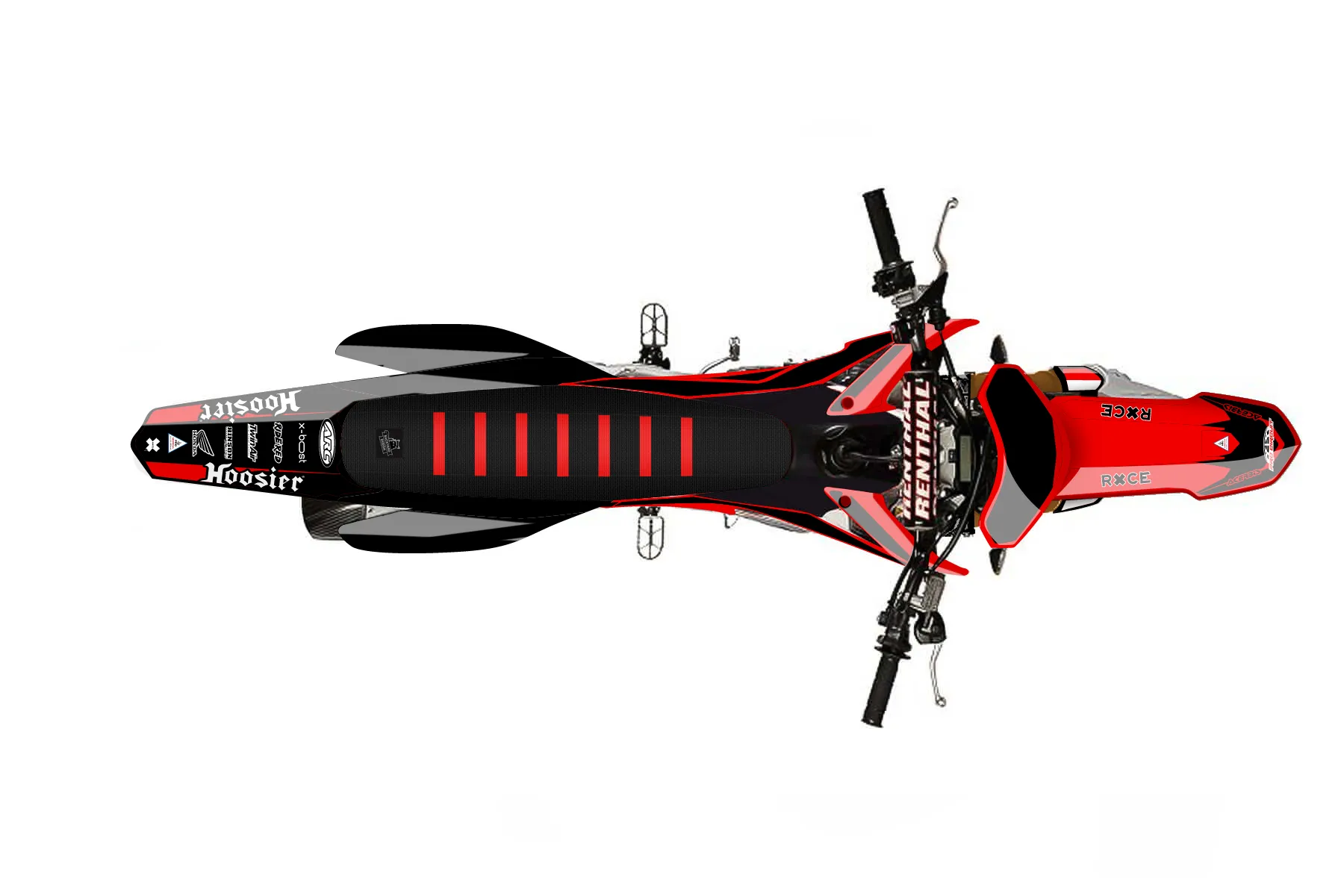 «Hoosier Tires» — готовый комплект графики серии Flow для Honda MX Graphic Kit Honda CRF250R 2014. В комплекте: графика на бак и боковые облицовки, крылья (переднее и заднее), передний щиток, номерные таблички, защита вилки. Материал: ПВХ-винил 80 мкр с холодной ламинацией 300 мкр, общая толщина 380 мкр; покрытие глянцевое или матовое на выбор. Устойчив к UV-излучению, воде, бензину и мойке высокого давления. Клей акриловый на сольвентной основе — постоянный, для гибких пластиков. На простых поверхностях монтируется без нагрева; для сложных изгибов рекомендуем фен. Этот пресет можно заказать как есть или взять за основу в конструкторе: поменять цвета, добавить стартовый номер и свой бренд. Производство — 3–5 рабочих дней, доставка по России СДЭКом или Почтой, по СНГ — курьерскими службами.