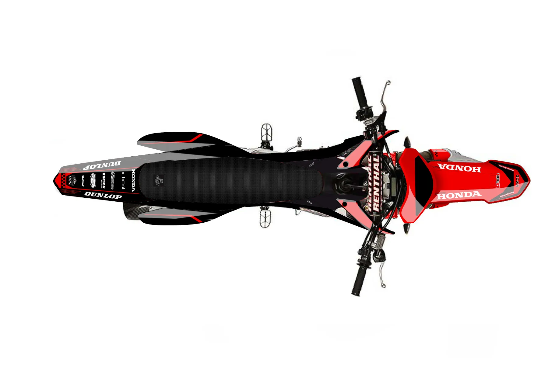 «2017 CRF250R» — готовый комплект графики серии Staple для Honda MX Graphic Kit Honda CRF250R 2015. В комплекте: графика на бак и боковые облицовки, крылья (переднее и заднее), передний щиток, номерные таблички, защита вилки. Материал: ПВХ-винил 80 мкр с холодной ламинацией 300 мкр, общая толщина 380 мкр; покрытие глянцевое или матовое на выбор. Устойчив к UV-излучению, воде, бензину и мойке высокого давления. Клей акриловый на сольвентной основе — постоянный, для гибких пластиков. На простых поверхностях монтируется без нагрева; для сложных изгибов рекомендуем фен. Этот пресет можно заказать как есть или взять за основу в конструкторе: поменять цвета, добавить стартовый номер и свой бренд. Производство — 3–5 рабочих дней, доставка по России СДЭКом или Почтой, по СНГ — курьерскими службами.
