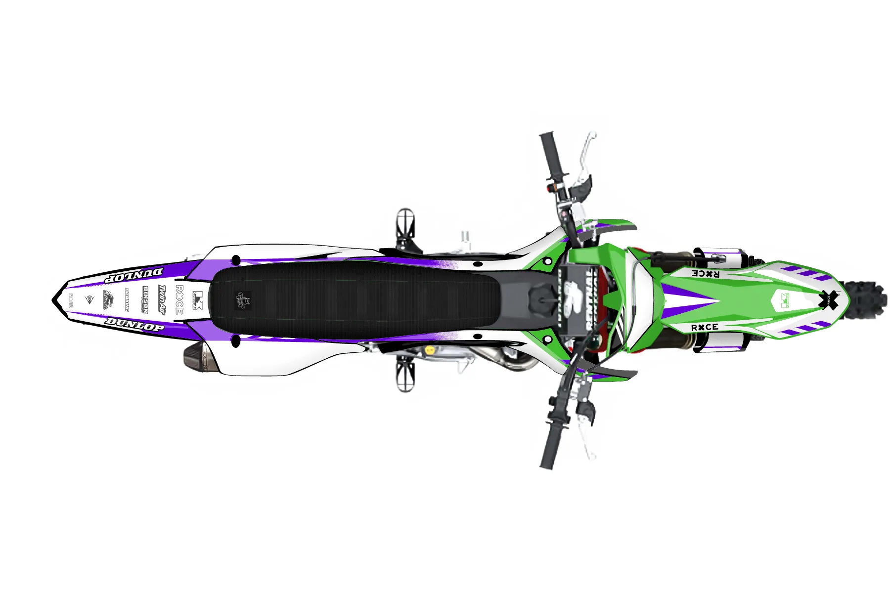 «CustomDesign» — готовый комплект графики серии Maverick для Kawasaki MX Graphic Kit Kawasaki KX 450 SR 2023. В комплекте: графика на бак и боковые облицовки, крылья (переднее и заднее), передний щиток, номерные таблички, защита вилки. Материал: ПВХ-винил 80 мкр с холодной ламинацией 300 мкр, общая толщина 380 мкр; покрытие глянцевое или матовое на выбор. Устойчив к UV-излучению, воде, бензину и мойке высокого давления. Клей акриловый на сольвентной основе — постоянный, для гибких пластиков. На простых поверхностях монтируется без нагрева; для сложных изгибов рекомендуем фен. Этот пресет можно заказать как есть или взять за основу в конструкторе: поменять цвета, добавить стартовый номер и свой бренд. Производство — 3–5 рабочих дней, доставка по России СДЭКом или Почтой, по СНГ — курьерскими службами.
